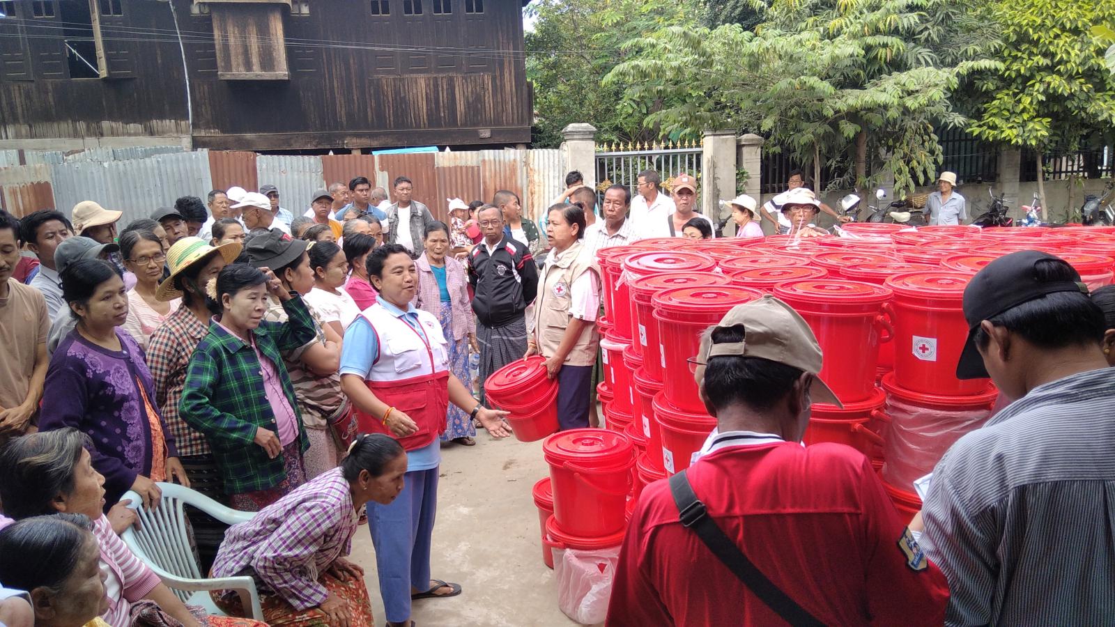 အဆိုပါပုံးများပေးအပ်ရာတွင် မြို့နယ်ကြက်ခြေနီတပ်ဖွဲ့မှူး ဒေါ်အေးအေးဆွေက ကြီးကြပ်၍ ဘုရင့်နောင်ရပ်ကွက်အတွင်း ငလျင်ဘေးသင့်ခံခဲ့ရသည့် အိမ်ထောင်စု ၂၅၀ စုကို တစ်အိမ်ထောင်လျှင် ပလတ်စတစ်ပုံးနှစ်ပုံးစီ ပေးအပ်ခဲ့ကြောင်း သိရသည်။
