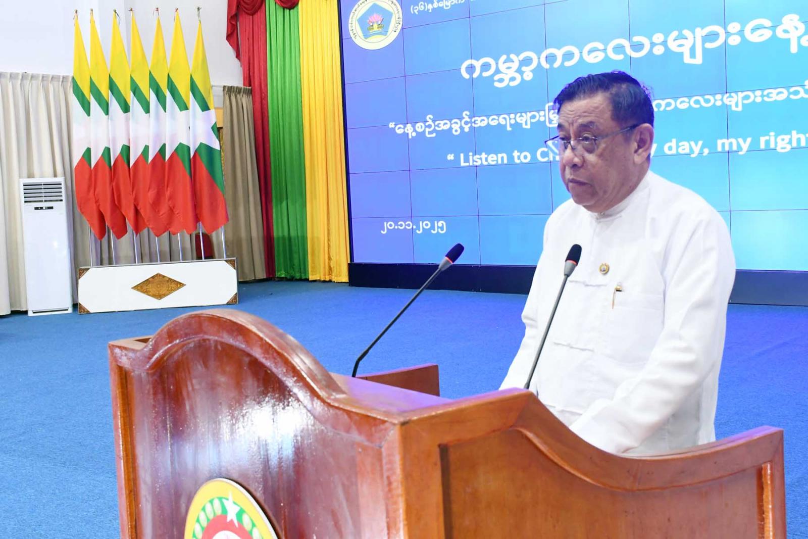 အခမ်းအနားတွင်တိုင်းဒေသကြီးဝန်ကြီးချုပ်ဦးမြတ်ကိုက ယနေ့ နိုဝင်ဘာလ (၂၀) ရက်နေ့သည် ကလေးသူငယ်အခွင့်အရေး များဆိုင်ရာ ကုလသမဂ္ဂကွန်ဗင်းရှင်းကို အတည်ပြုသည့်နေ့( UNCRC Day) ဖြစ်သလို ကမ္ဘာ့ကလေးများနေ့ (World's Children Day) လည်း ဖြစ်ကြောင်း၊ ကမ္ဘာတစ်ဝှမ်းလုံးရှိကလေးများ၏ အနာဂတ်ပိုမိုတောက်ပစေနိုင်ရေး၊ ကလေးများကို ကာကွယ်မှုအပြည့်အဝပေးနိုင်ရေး၊ ကလေးများ၏အခွင့်အရေး ပိုမိုရရှိနိုင်စေရေး၊ ကလေးများ ရင်ဆိုင်ကြုံတွေ့ရသော အခက်အခဲများကို အတူတကွ ဖြေရှင်းပေးနိုင်ရေးစသည့် ရည်ရွယ်ချက်များဖြင့် ကမ္ဘာ့နိုင်ငံအသီးသီးတွင် အထိမ်းအမှတ်အခမ်းအနားများကျင်းပလျက်ရှိကြောင်း၊ နှစ်စဉ်နိုဝင်ဘာလ(၂၀)ရက်နေ့ရောက်တိုင်း “ကမ္ဘာ့ကလေးများနေ့” အဖြစ် နိုင်ငံတကာတွင် အခမ်းအနားများကျင်းပသည့် နည်းတူ မြန်မာနိုင်ငံတွင်လည်း ကလေးသူငယ်များ၏အရေးပါသောအခန်းကဏ္ဍကို ထင်ဟပ်ပေါ်လွင်စေရန် နိုင်ငံတော်အဆင့်အခမ်းအနား ကျင်းပသလို တိုင်းဒေသကြီး/ပြည်နယ်အသီးသီးမှာလည်း ယခုလိုအခမ်းအနားများ ကျင်းပဆောင်ရွက်လျက်ရှိကြောင်း၊ တိုင်းဒေသကြီးအနေဖြင့် တိုင်းဒေသကြီး၊ ခရိုင်နှင့် မြို့နယ် ကလေးသူငယ်အခွင့်အရေးများဆိုင်ရာကော်မတီများကို ဖွဲ့စည်းပေးခဲ့ပြီးဖြစ်ကြောင်း၊ ကလေးသူငယ်အခွင့်အရေးများ ဆိုင်ရာကုလသမဂ္ဂ သဘောတူစာချုပ်မှာပါရှိသည့် ကလေးသူငယ်အခွင့်အရေး (၄) ရပ်ဖြစ်သော ကလေးသူငယ်များ အသက်ရှင်သန်ခွင့်၊ ကလေးသူငယ်များ ဖွံ့ဖြိုးတိုးတက်ခွင့်၊ကလေးသူငယ်များကိုအကြမ်းဖက်မှု၊ လျစ်လျူရှုမှုနှင့် ခေါင်းပုံဖြတ်မှုအမျိုးမျိုးမှ ကာကွယ်စောင့်ရှောက်ခံပိုင်ခွင့်နှင့် ကလေးသူငယ်များ၏အရေးကိစ္စရပ်များတွင် ကလေးသူငယ်များကိုယ်တိုင် ပူးပေါင်းပါဝင်ဆောင်ရွက်ခွင့်တို့ကို သက်ဆိုင်ရာဌာနအဖွဲ့အစည်းများနှင့် လက်တွဲပူးပေါင်းအကောင်အထည်ဖော်ဆောင်ရွက်လျက်ရှိကြောင်း၊ ကလေးသူငယ်အခွင့်အရေးများဆိုင်ရာဥပဒေပါ ကလေးသူငယ်အခွင့်ရေးများကို ကလေးသူငယ်တိုင်းက အပြည့်အဝခံစားခွင့်ရအောင် ကလေးသူငယ်များ၏ အရေးကိစ္စကို ဆောင်ရွက်နေကြသည့်ဌာနများ၊ အဖွဲ့အစည်းများက အကောင်အထည်ဖော်ဆောင်ရွက်ပေးကြရန် လိုအပ်ကြောင်း၊ ကလေးသူငယ်များ၏ အနာဂတ်ဘဝ စုံလင်ပြည့်ဝပွင့်လန်းဝေဆာရန် နှင့်နောင်တစ်ချိန်တွင် တိုင်းပြည်အတွက် အားကိုးအားထားပြုရသော နိုင်ငံ့သားကောင်းရတနာများဖြစ်လာအောင် ဝိုင်းဝန်းကြိုးပမ်းဆောင်ရွက်ပေးကြရန်လိုအပ်ကြောင်းပြောကြားသည်။