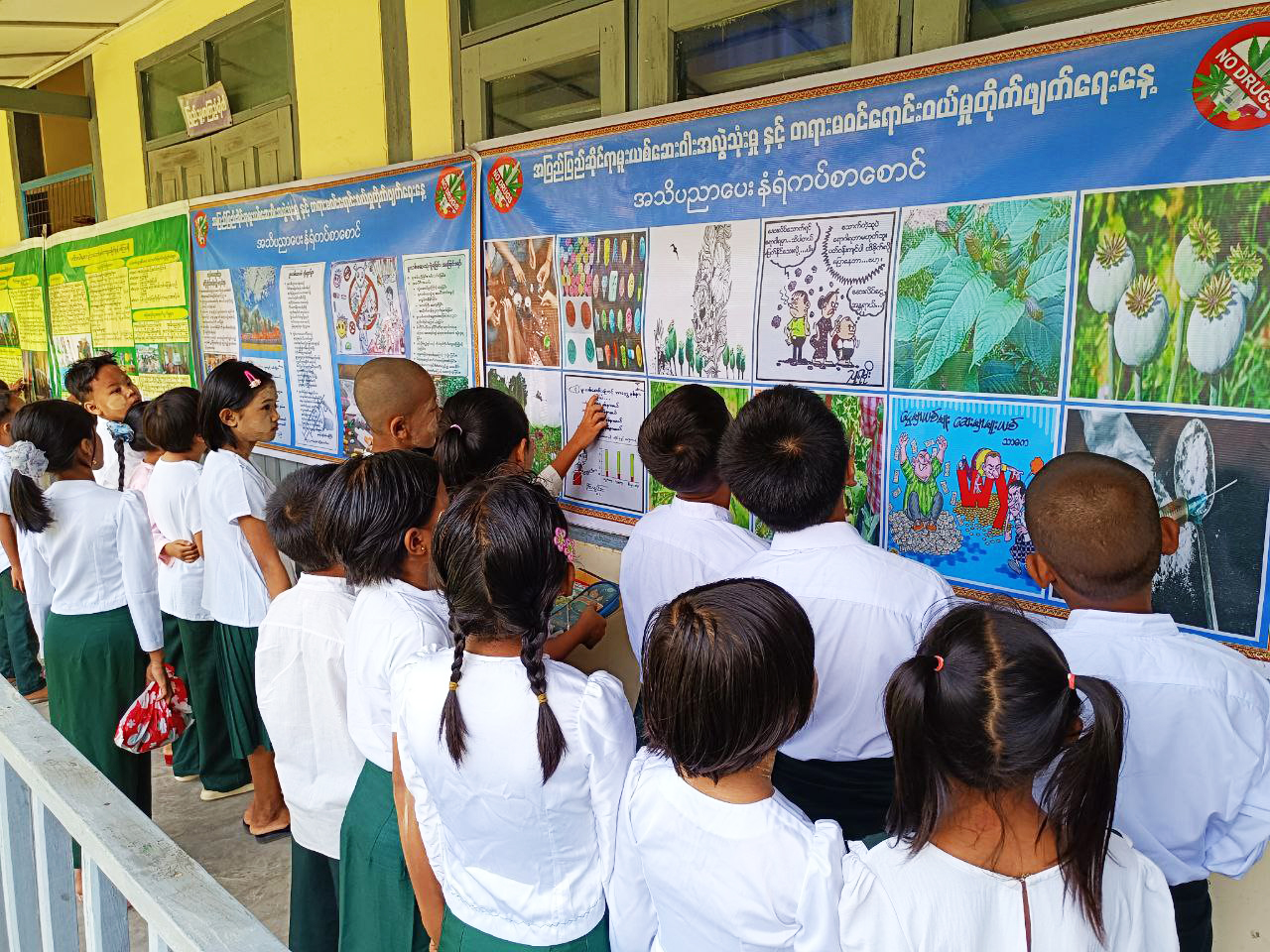 ထို့နောက် ပြန်ကြားရေးနှင့်ပြည်သူ့ဆက်ဆံရေးဦးစီးဌာနမှ ခင်းကျင်းပြသထားသည့် သုတ ရသ စာအုပ်စာစောင်ပြပွဲနှင့် မူးယစ်ဆေးဝါးအသိပညာပေး၊ မီးခိုးမြူငွေ့အန္တရာယ်အသိပညာပေး နံရံကပ် စာစောင်တို့ကို ကျောင်းသား၊ ကျောင်းသူများက စိတ်ပါဝင်စားစွာဖြင့် လေ့လာကြည့်ရှုခဲ့ကြကြောင်း သိရသည်။