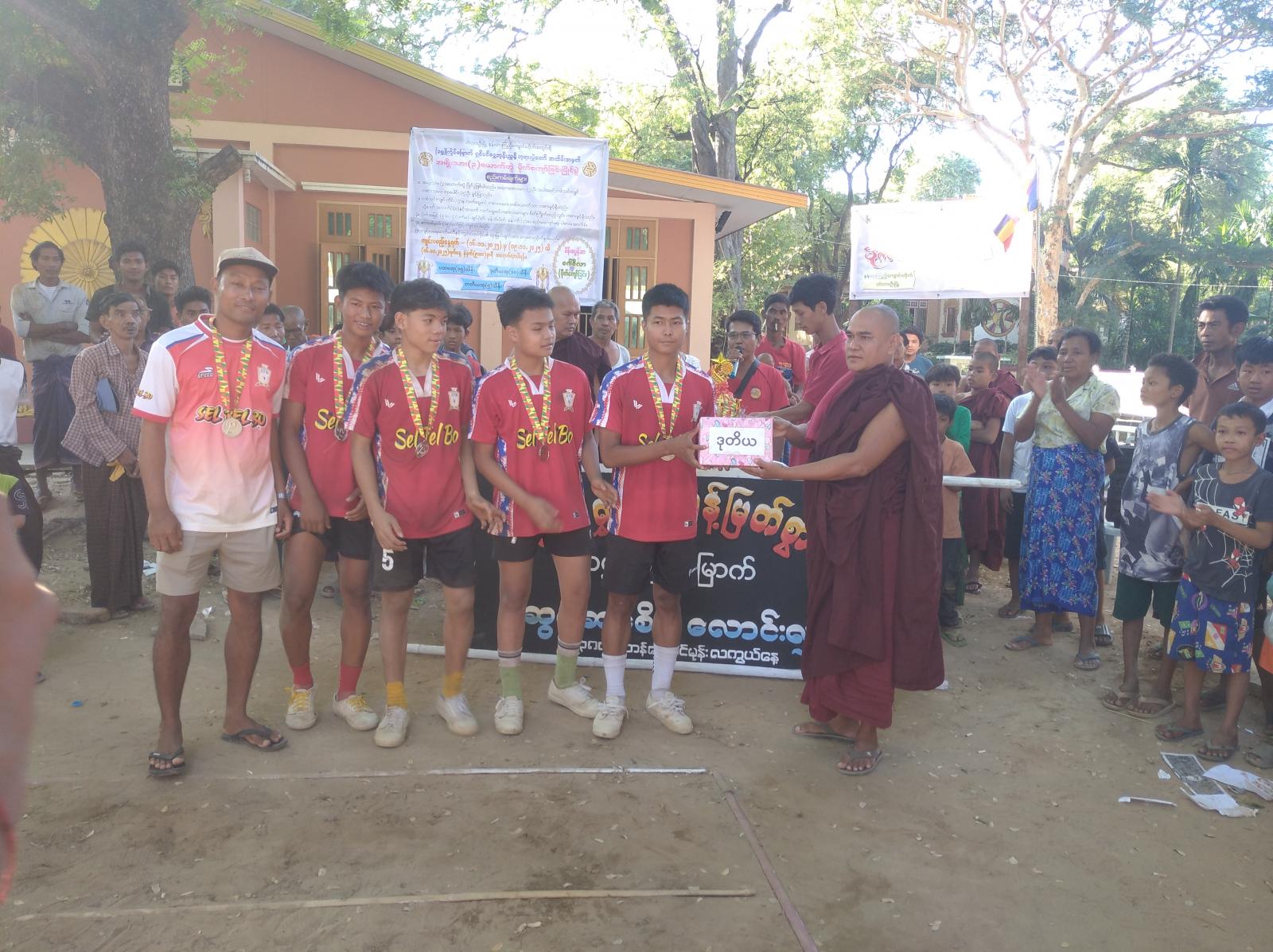 ထို့နောက် ဆုချီးမြှင့်ခြင်းအခမ်းအနားကို ဆက်လက်ကျင်းပရာ တတိယဆုရရှိသော အလ္လကပ္ပအသင်းအား တံတားဦးမြို့နယ်စီမံခန့်ခွဲရေးနှင့် လုံခြုံရေးကော်မတီအဖွဲ့ဝင် ဗိုလ်မှူးသန်းနိုင်ဦးက ဆုတံဆိပ်နှင့်ငွေသား(၅)သိန်းကျပ်ကိုလည်းကောင်း၊ ဒုတိယဆုရရှိသော မြက်ခင်းတု(၂)အသင်းအား ဂိုဏ်းထောက်ဘုန်းတော်ကြီးကျောင်းဆရာတော်မှ ဆုတံဆိပ်နှင့်ငွေသား(၁၀)သိန်းကျပ်ကိုလည်းကောင်း၊ ပထမဆုရရှိသောကိုယ်ပိုင်အသင်းအား နန်းယာကြည့် ဘုန်းတော်ကြီး ကျောင်းဆရာတော် ဘဒ္ဒန္တစန္ဒိမာက ဆုတံဆိပ်၊ ဆုဖလားနှင့် ငွေသား(၁၅)သိန်းကျပ်ကိုလည်းကောင်း ဆုများအသီးသီးချီးမြှင့်ပေးအပ်ကြကြောင်း သိရသည် ။