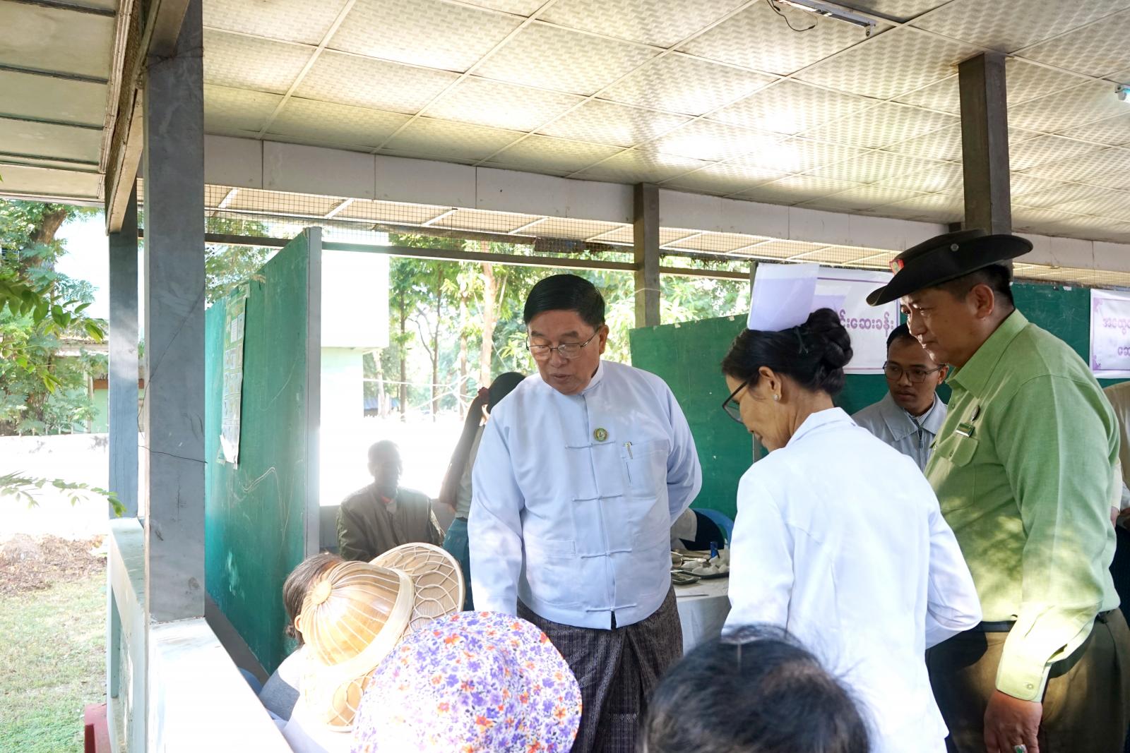 မကွေးမြို့ မြန်မာ့စီးပွားရေးဘဏ်တွင် နိုင်ငံ့ဝန်ထမ်း(အငြိမ်းစား)များအား ကျန်းမာရေးစောင့်ရှောက်မှုများကို လက်လှမ်းမီရရှိစေရေးနှင့်စိုက်ထုတ်ကုန်ကျရသော ဆေးကုသမှုစရိတ်လျော့နည်းကျဆင်းစေရေးအတွက် တိုင်းဒေသကြီးအစိုးရအဖွဲ့၏ စီစဉ်ဆောင်ရွက်မှုဖြင့် ကျန်းမာရေး စောင့်ရှောက်မှုအဖြစ် အခမဲ့ဆေးကုသပေးခြင်းကို ဖွင့်လှစ်ဆောင်ရွက်ထားရှိရာ နိုဝင်ဘာ ၂၁ ရက် ယနေ့နံနက် ၈ နာရီက တိုင်းဒေသကြီးဝန်ကြီးချုပ် ဦးတင့်လွင်နှင့် အဖွဲ့ဝင်ဝန်ကြီးများက နိုင်ငံ့ဝန်ထမ်း(အငြိမ်းစား)များအား အခမဲ့ဆေးကုသပေးခြင်းနှင့် တစ်ဦးလျှင် ဆန်တစ်ပြည်၊ ဆီ(၅၀)ကျပ်သားတို့အား ချီးမြှင့်ပေးနေမှုအား သွားရောက် ကြည့်ရှုအားပေးသည်။