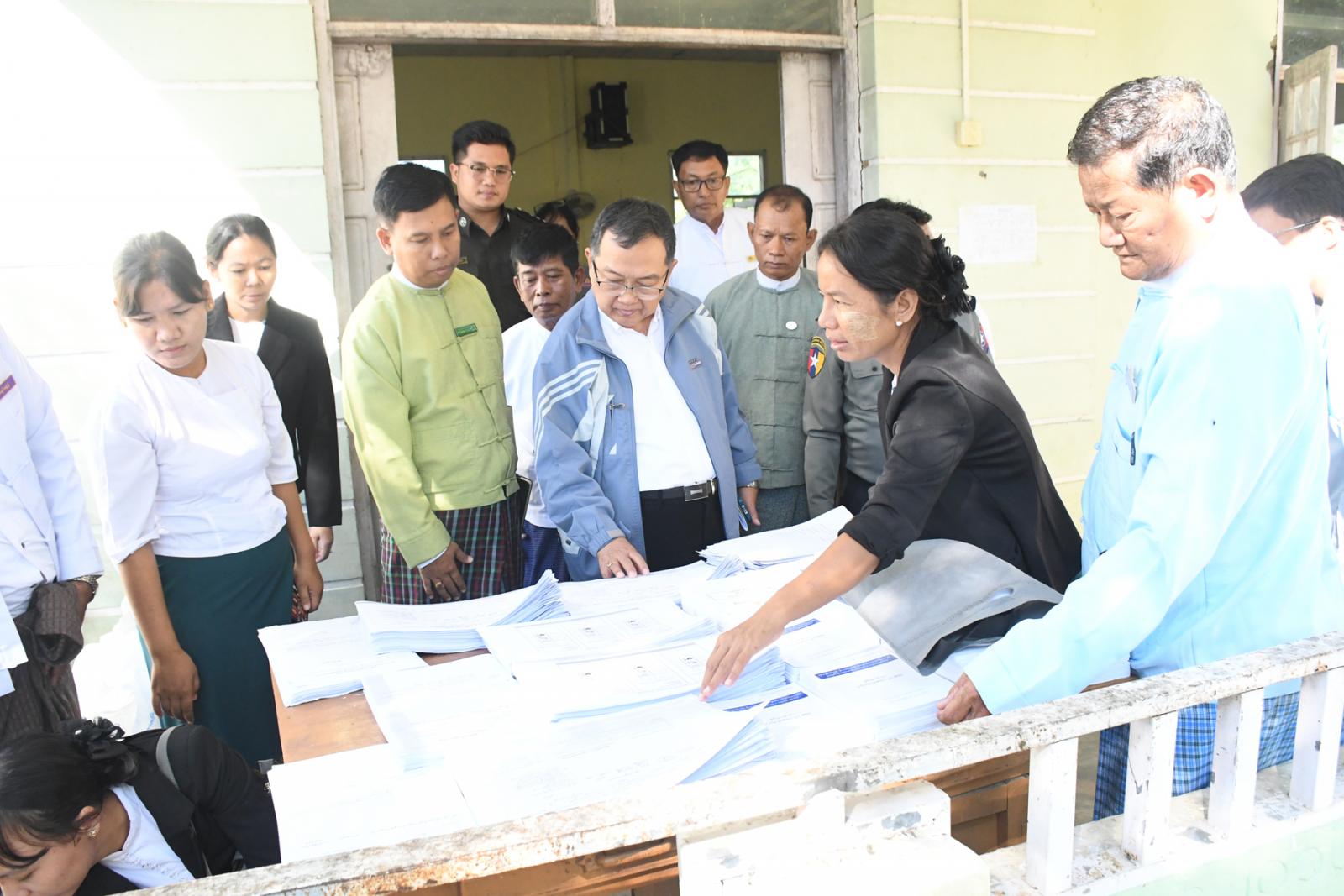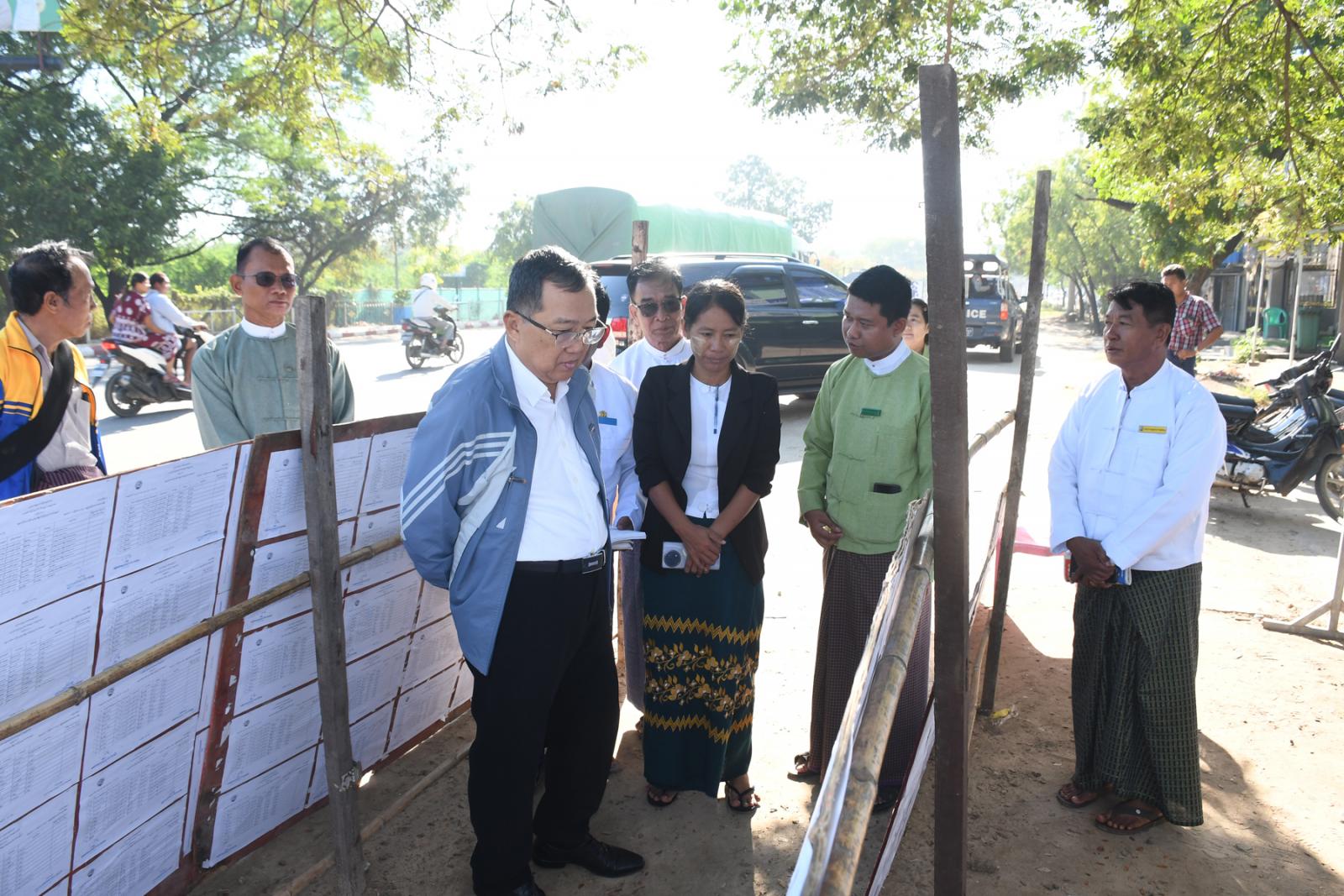 ရှေးဦးစွာ ပြည်ထောင်စုရွေးကောက်ပွဲကော်မရှင်အဖွဲ့ဝင် ဦးသန်းအောင်ကျော်သည် ရွှေပြည်ရန်နိုင်ရပ်ကွက် အုပ်ချုပ်ရေးမှူးရုံး၌ မဲဆန္ဒရှင်စာရင်းများ ကြေညာထားမှုကို ကြည့်ရှုအားပေးပြီး မြို့မရဲစခန်းတွင် မြန်မာအီလက် ထရောနစ်မဲပေးစက်များ ရောက်ရှိ ထိန်းသိမ်းထားမှုကို ကြည့်ရှုစစ်ဆေးပြီး လုပ်ငန်းလိုအပ်ချက်များ ရှိလာပါက အချိန်နှင့်တပြေးညီတင်ပြနိုင်ရေးတို့ကို ဆွေးနွေးသည်။