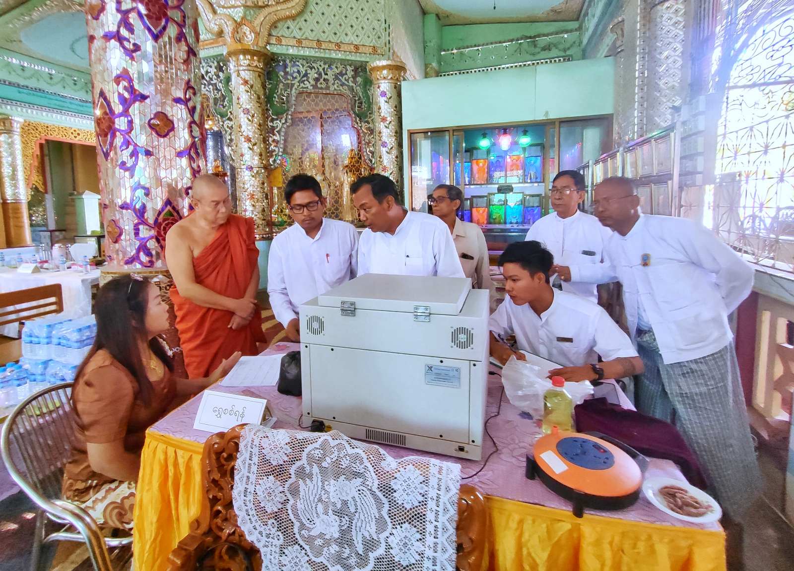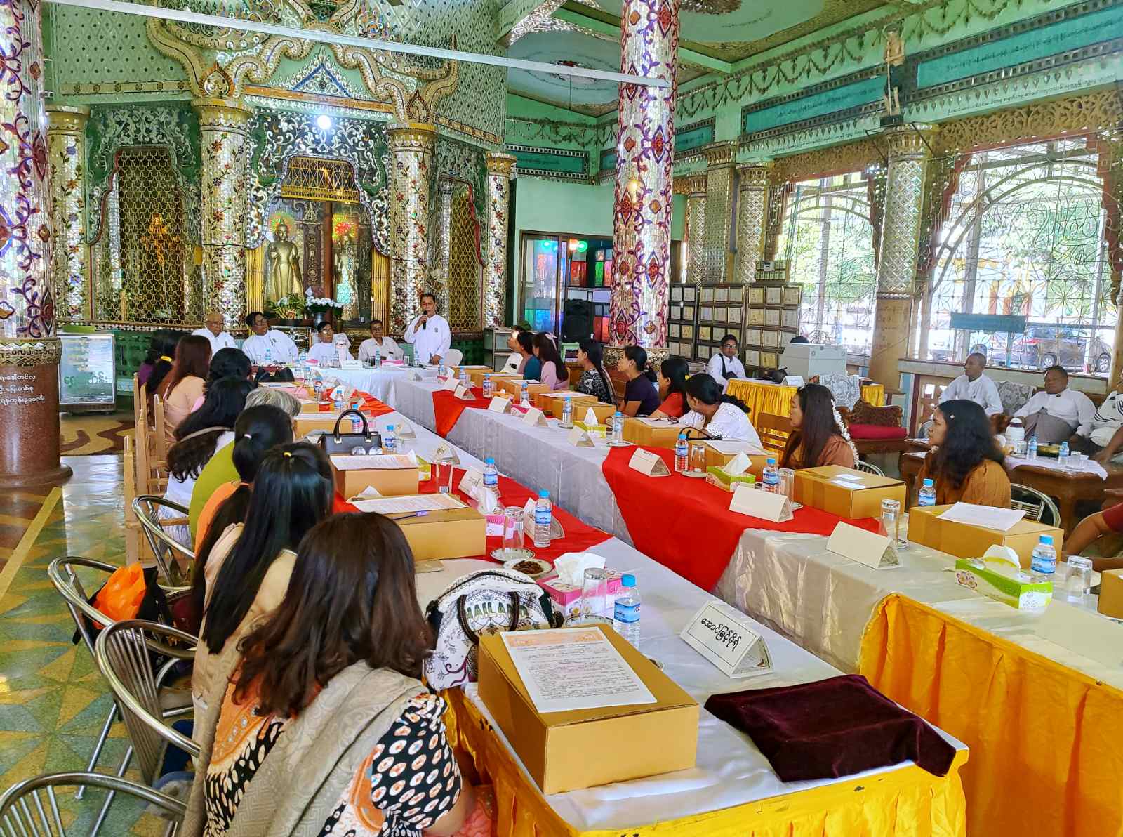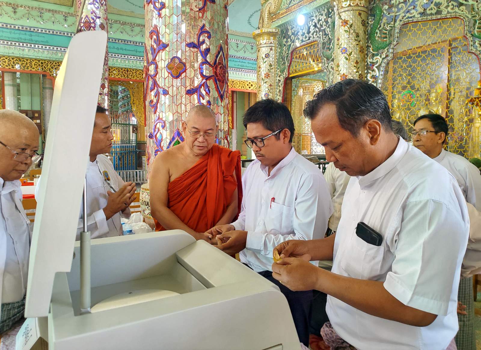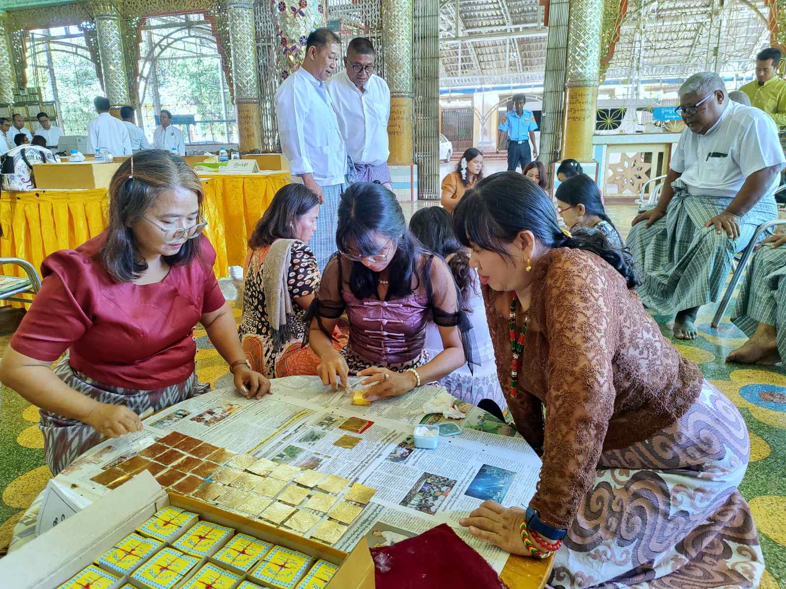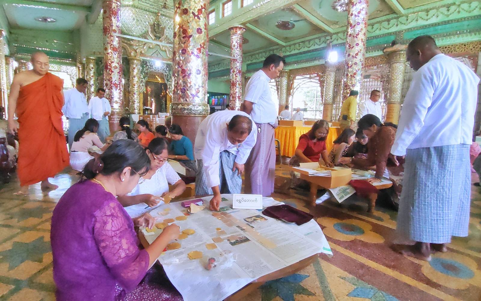 ဆက်လက်၍ ရွှေဆိုင်လုပ်ငန်းရှင်များအလိုက် ရွှေဆိုင်းများရေတွက်ခြင်း၊ ရွှေပါဝင်မှုအရည်အသွေးအား ရွှေစစ်စက်ဖြင့် စစ်ဆေးခြင်းလုပ်ငန်းများကို ဩဝါဒစရိယဆရာတော်များ၊ ဘုရားကြီးဂေါပကအဖွဲ့ဝင်များ၊ ရွှေလုပ်ငန်းကျွမ်းကျင်ပညာရှင်များ၏ အနီးကပ်ကြီးကြပ်မှုဖြင့် ဆောင်ရွက်ကြပြီး ခရိုင်သာသနာရေးဦးစီးဌာနမှ လက်ထောက်ညွှန်ကြားရေးမှူး ဦးကျင်ရွှေက လုပ်ငန်းများအောင်မြင်စွာ ဆောင်ရွက်နိုင်ရေး အမှာစကားပြောကြားသည်။