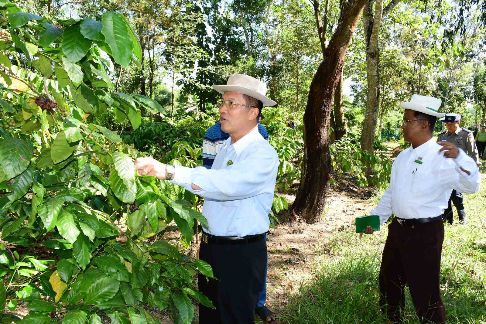 ဦးစွာ တိုင်းဒေသကြီးဝန်ကြီးချုပ်နှင့်အဖွဲ့သည် ပုသိမ်-မော်တင်ကားလမ်းဘေး (၂၈) မိုင်ရှိ Myanmar Agri-Tech Ltd ၏ သဘာဝတောနှင့် ထပ်မံစိုက်ပျိုးထားသည့် အပင်များအောက်တွင် စိုက်ပျိုးထားသည့် ရိုဘက်စတာ မြေပြန့်ကော်ဖီပင်များ ရှင်သန်ဖြစ်ထွန်းအောင်မြင်မှုများကို ကြည့်ရှုအားပေးခဲ့ပြီး ကော်ဖီပင်အောက်ခြေပေါင်းမြက်များရှင်းလင်းခြင်း၊ မြေဆွခြင်း၊ ကော်ဖီသီးများ စတင်ခူးဆွတ်အခြောက်ခံခြင်းများကို ကြည့်ရှုအားပေးခဲ့ရာ တာဝန်ယူ ဆောင်ရွက်လျက်ရှိသည့် ကုမ္ပဏီတာဝန်ရှိသူတစ်ဦးက ရိုဘက်စတာ Robusta(TR4/TR9) တစ်ဧကလျှင် ကော်ဖီပင်(၄၃၅) ပင်စီဖြင့် ၃၁၀ ဧက စိုက်ပျိုးထားရှိမှု၊ အပင်သက်တမ်း သုံးနှစ်ကျော်ချိန်မှ စတင်၍ အသီးမှည့် ခူးဆွတ်လာခဲ့ရာ နှစ်စဉ်တိုးတက်လာမှု၊ ရေ၊ မြေ၊ ရာသီဥတုနှင့်ကိုက်ညီသော မျိုး၊ မြေဩဇာ၊ ဆေးဝါးသုံးစွဲမှု၊ ရေလိုအပ်မှုနှင့် ပျိုးခြံတွင် ပျိုးထောင်မှုတို့အား ရှင်းလင်းတင်ပြခဲ့ရာ တိုင်းဒေသကြီးဝန်ကြီးချုပ်က မိမိတို့တိုင်းဒေသကြီးတွင် ကော်ဖီသီးနှံများလည်း စိုက်ပျိုးဖြစ်ထွန်းအောင်မြင်ပါကြောင်း၊ ဥယျာဉ်ခြံများ၊ နှစ်ရှည်သစ်တောစိုက်ခင်းများအတွင်း မြေပြန့်ကော်ဖီ (ရိုဘက်စတာမျိုး) များကို စိုက်ပျိုးဆောင်ရွက်မည်ဆိုပါက များစွာအကျိုးဖြစ်ထွန်းစေမည်ဖြစ်ပြီး ပြည်ပပို့ကုန်များ ပိုမိုတိုးတက်ရရှိမည်ဖြစ်ကြောင်း၊ ကော်ဖီစံပြစိုက်ခင်းများ ထူထောင်လုပ်ကိုင်မည်ဆိုပါက ကော်ဖီစိုက်ပျိုးရေးကိုစိတ်ဝင်စားသည့် လုပ်ငန်းရှင်များ၊ ကော်ဖီစိုက်တောင်သူများကလည်း ပေါ်ထွက်လာမည်ဖြစ်ပါကြောင်း မှာကြားခဲ့သည်။