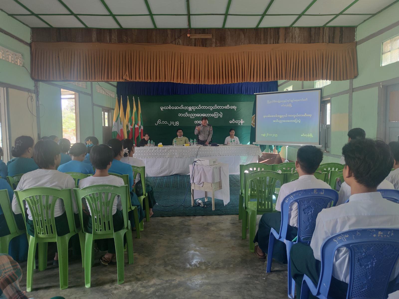မကွေးတိုင်းဒေသကြီး၊ မင်းတုန်းမြို့ အခြေခံပညာအထက်တန်းကျောင်းခန်းမတွင် ယမန်နေ့ မွန်းလဲ ၁ နာရီခွဲက မူးယစ်ဆေးဝါးအန္တရာယ်အသိပညာပေးဟောပြောပွဲကျင်းရာ အထက်တန်းကျောင်းသား/ကျောင်းသူ (၂၀၀)ဦး တက်ရောက်ခဲ့ကြသည်။