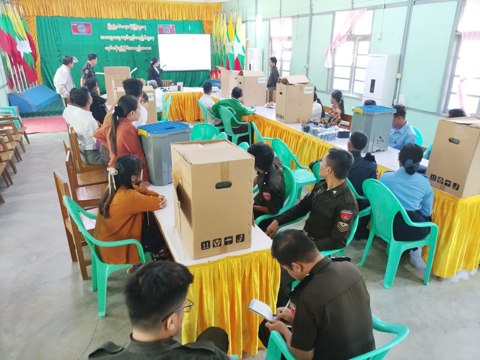 အဆိုပါ သင်တန်းဖွင့်ပွဲတွင် မြို့နယ်စီမံခန့်ခွဲရေးနှင့်အုပ်ချုပ်ရေးကော်မတီဥက္ကဋ္ဌ ဦးသန်းထွန်းအောင်က သင်တန်းသား၊ သင်တန်းသူများအနေဖြင့် မဲရုံအသီးသီးမှ မဲပေးစက်ကိုင်တွယ် အသုံးပြုရာတွင် ကျွမ်းကျင်ပိုင်နိုင်စေရေးအတွက် အလေးအနက်ထားကာ သင်ယူစေလိုကြောင်း၊ မဲစာရင်းမှန်ကန်စေရေး အလေးထားဆောင်ရွက်ရန်၊ ဌာနဆိုင်ရာဝန်ထမ်းများ အားလုံးပူးပေါင်းဆောင်ရွက်ရန်လိုအပ်ကြောင်း ပြောကြားကာ မြို့နယ်ရွေးကောက်ပွဲကော်မရှင်အဖွဲ့ခွဲရုံးမှ ဦးစီးအရာရှိ ဒေါ်ခိုင်မို့မို့ကျော်က ပါတီစုံဒီမိုကရေစီအထွေထွေရွေးကောက်ပွဲတွင် မြန်မာအီလက်ထရောနစ်မဲပေးစက်များကို တစ်နိုင်ငံလုံးအတိုင်းအတာဖြင့် အသုံးပြုမည်ဖြစ်ကြောင်း၊ မဲပေးစက်များနှင့်စပ်လျဉ်း၍ စက်များစစ်ဆေးခြင်း၊ စက်အစိတ်အပိုင်းများချို့ယွင်းမှု တစ်စုံတစ်ရာရှိပါက ပြင်ဆင်ခြင်း၊ မဲပေးစက်တွင် သက်ဆိုင်ရာလွှတ်တော်မဲဆန္ဒနယ်အလိုက် ကိုယ်စားလှယ်လောင်းအမည်ပါစာရွက်များကပ်နှိပ်ခြင်း၊ SD ကတ်များထည့်သွင်းခြင်း စသည့်လုပ်ငန်းများတွင် အထောက်အကူပြုနိုင်ရေးအတွက် ယခုသင်တန်းကို စီစဉ် ဆောင်ရွက်ခြင်းဖြစ်ပါကြောင်းပြောကြားပြီး အီလက်ထရောနစ် မဲပေးစက်နည်းပညာ အထောက်အကူသင်တန်းကို မဲရုံတွင်တာဝန်ထမ်းဆောင်မည့် ဌာနဆိုင်ရာဝန်ထမ်း ၃၀ ဦးအား သင်ကြားပို့ချလျက်ကြောင်း သိရသည်။