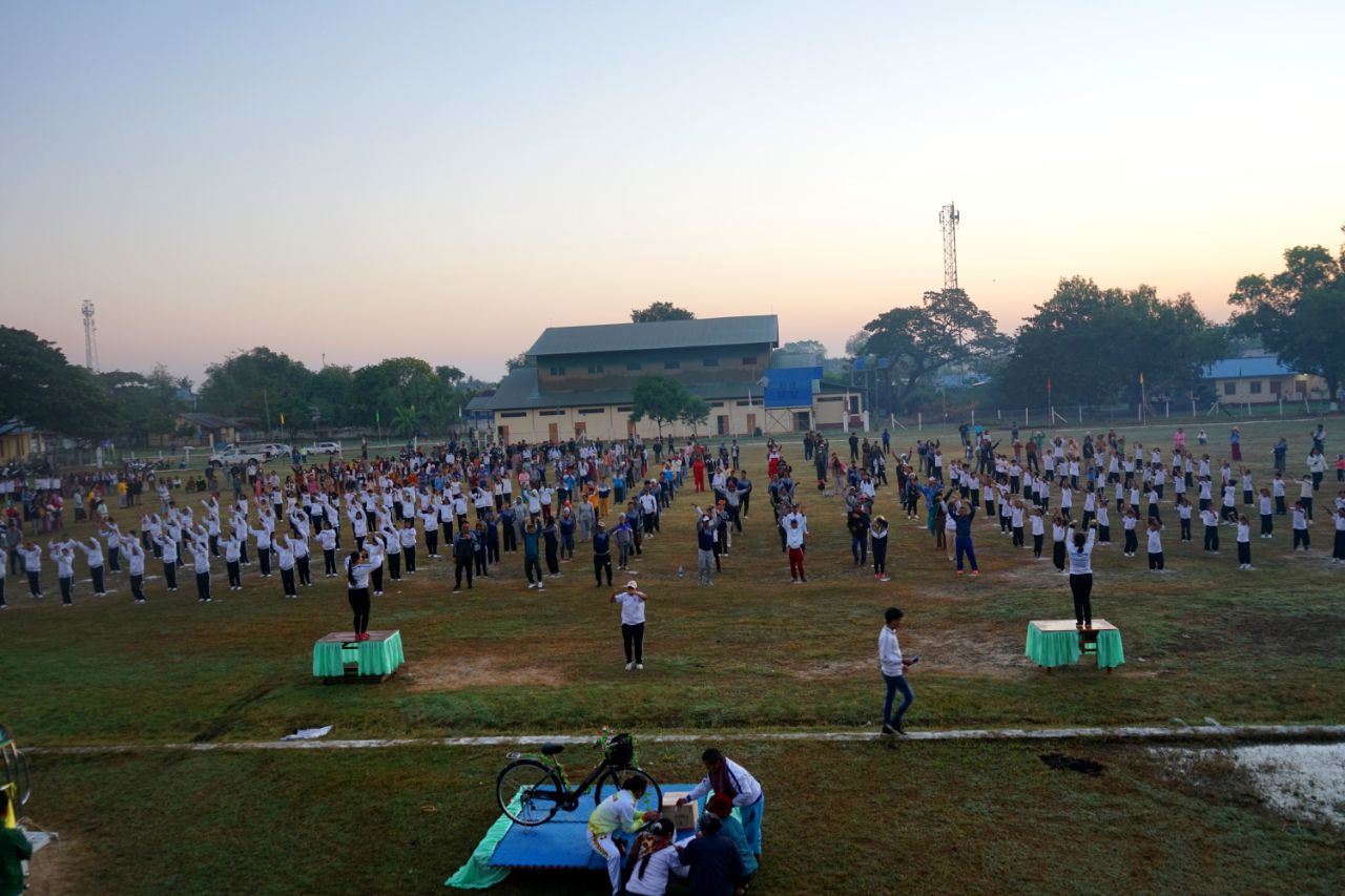 ထို့နောက် ခရိုင်နှင့်မြို့နယ် အားကစားနှင့် ကာယပညာဦးစီးဌာနမှ ကာယနည်းပြများက ဦးဆောင်၍ ခရိုင်အားကစားကွင်းရှိ ဘောလုံးကွင်းအတွင်း၌ ကိုယ်လက်လှုပ်ရှား အားကစားအဖြစ် အကြောလျှော့လေ့ကျင့်ခန်းများနှင့် သွေးပူလေ့ကျင့်ခန်းများကို ပျော်ပျော်ပါးပါး လှုပ်ရှားဆောင်ရွက်ခဲ့ကြပြီးနောက် လူထုအားကစားလှုပ်ရှားမှုတွင် ပါဝင်ဆင်နွှဲကြသူများကို အမှတ်တရလက်ဆောင် ကံစမ်းမဲအဖြစ် စက်ဘီးတစ်စီးနှင့် ထမင်းပေါင်းအိုးတစ်လုံး မဲဖောက်ပေးခဲ့ကြောင်း သိရသည်။
