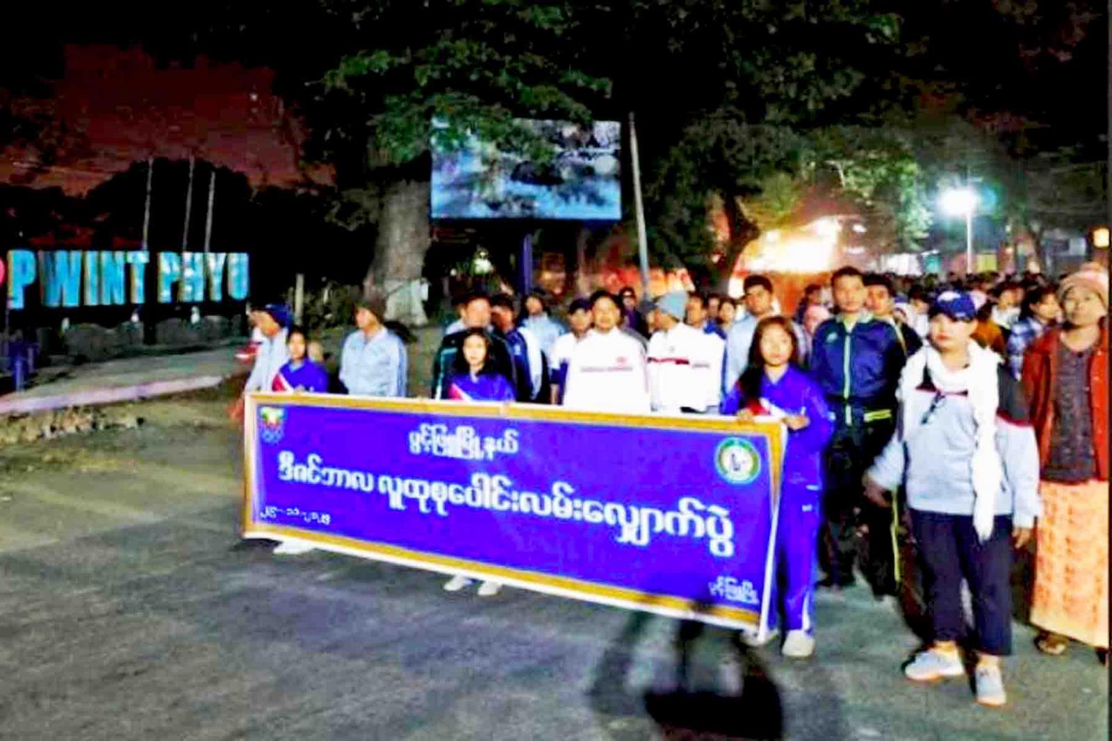 ရှေးဦးစွာ မြို့နယ်စီမံခန့်ခွဲရေးနှင့် အုပ်ချုပ်ရေးကော်မတီဥက္ကဋ္ဌနှင့် စုပေါင်းလမ်းလျှောက်ပွဲ ပါဝင်ဆင်နွှဲကြသူများက စုရပ်ဖြစ်သည့် မြို့နယ်အထွေထွေအုပ်ချုပ်ရေးဦးစီးဌာနရုံးရှေ့မှ မြို့ပတ်လမ်း လေးတိုင်စင်လမ်းဆုံအထိ စုပေါင်းလမ်းလျှောက်ခဲ့ကြပြီး ထို့မှတစ်ဆင့် မြို့နယ်ပြည်သူ့အားကစားကွင်းသို့ ပြန်လည်ဝင်ရောက်ခဲ့ကာ မြို့နယ်အားကစားနှင့် ကာယပညာဦးစီးဌာန၏ ဦးဆောင်မှုဖြင့် အကြော့လျှော့လေ့ကျင့်ခန်းများနှင့် ကိုယ်လက်ကြံ့ခိုင်ရေး လေ့ကျင့်ခန်းများကို တစ်ပျော်တစ်ပါး စုပေါင်းဆောင်ရွက်ခဲ့ကြသည်။