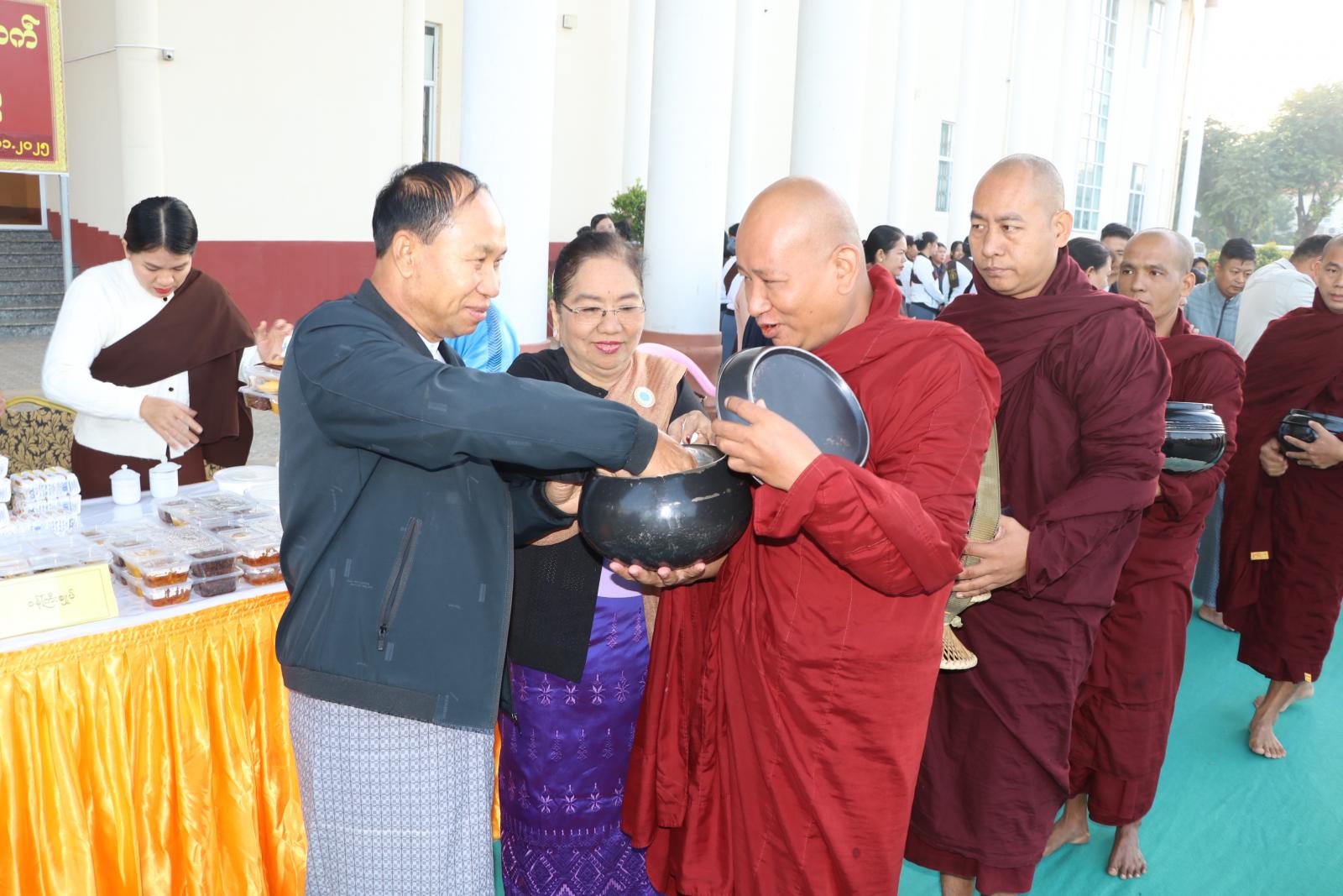 ဆက်လက်၍ တိုင်းဒေသကြီး ဝန်ကြီးချုပ်နှင့်ဇနီး၊ တာဝန်ရှိသူများ၊ အလှူရှင်များက ပင့်သံဃာဆရာတော်၊ သံဃာတော်များအား ဆွမ်း၊ဆွမ်းဟင်း၊ သစ်သီး၊ အချိုပွဲများနှင့်ဝတ္ထု ငွေများအားလောင်းလှူခဲ့ကြပြီး သီလရှင်ဆရာကြီး၊ ဆရာလေးများအား ဆွမ်းဆန်စိမ်း၊စား သုံးဆီနှင့်လှူဖွယ်ဝတ္ထုများအား ဆက်ကပ်လောင်းလှူကြသည်။