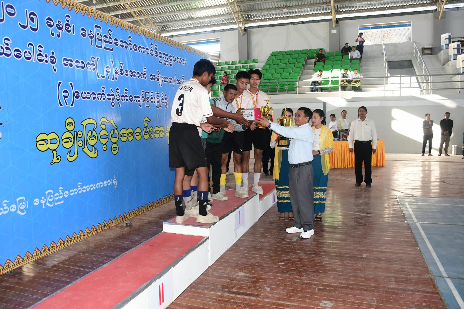 ယင်းနောက် ဆုချီးမြှင့်ပွဲအခမ်းအနားကို ဆက်လက်ကျင်းပရာ အမျိုးသမီး(၃)ဦးတွဲပြိုင်ပွဲတွင် ပွဲစဉ်တစ်လျှောက် အကောင်းဆုံးအားကစားသမားဆုရရှိသူအား နေပြည်တော်စည်ပင်သာယာရေးကော်မတီ ဒုတိယမြို့တော်ဝန်ကလည်းကောင်း၊ အမျိုးသား(၃)ဦးတွဲပြိုင်ပွဲတွင် ပွဲစဉ်တစ်လျှောက်အကောင်းဆုံး အားကစားသမားဆုရရှိသူအား နေပြည်တော်ကောင်စီဝင် ဦးခင်မောင်လတ်ကလည်းကောင်း၊ အမျိုးသမီး(၃)ဦးတွဲပြိုင်ပွဲတွင် တတိယဆုရရှိသော ပုဗ္ဗသီရိမြို့နယ်အသင်းအား နေပြည်တော်ကောင်စီဝင် ဦးဟန်သူကလည်းကောင်း၊ အမျိုးသား(၃)ဦးတွဲပြိုင်ပွဲတွင် တတိယဆုရရှိသော ပုဗ္ဗသီရိမြို့နယ်အသင်းအား နေပြည်တော်ကောင်စီဝင် ဦးမင်းဦးကလည်းကောင်း၊ အမျိုးသမီး(၃)ဦးတွဲပြိုင်ပွဲတွင် ဒုတိယဆုရရှိသည့် ဇေယျာသီရိမြို့နယ်အသင်းအား နေပြည်တော်ကောင်စီဝင် ဦးမြင့်စိုးကလည်းကောင်း၊ အမျိုးသား(၃)ဦးတွဲပြိုင်ပွဲတွင် ဒုတိယဆုရရှိသည့် ပျဉ်းမနားမြို့နယ်အသင်းအား နေပြည်တော်ကောင်စီဝင် ဦးဇေယျာလင်းက လည်းကောင်း၊ အမျိုးသမီး(၃)ဦးတွဲပြိုင်ပွဲတွင် ပထမဆုရရှိသည့် ပျဉ်းမနားမြို့နယ်အသင်းအား နေပြည်တော်ကောင်စီဝင် ဗိုလ်မှူးကြီးရဲမိုးကလည်းကောင်း၊ အမျိုးသား(၃)ဦးတွဲပြိုင်ပွဲတွင် ပထမဆုရရှိသည့် တပ်ကုန်းမြို့နယ်အသင်းအား နေပြည်တော်ကောင်စီဥက္ကဋ္ဌ ဦးသန်းထွန်းဦးက တစ်ဦးချင်းဆုတံဆိပ်၊ ငွေသားဆုများနှင့် တံခွန်စိုက်ဖလားတို့အားလည်းကောင်း အသီးသီးပေးအပ်ချီးမြှင့်ခဲ့ပြီး အားကစားသမားများအား နေပြည်တော်ကောင်စီဥက္ကဋ္ဌက ရင်းရင်းနှီးနှီးနှုတ်ဆက်ခဲ့ပြီး အမှတ်တရစုပေါင်းမှတ်တမ်းတင်ဓာတ်ပုံရိုက်ကူးကြသည်။