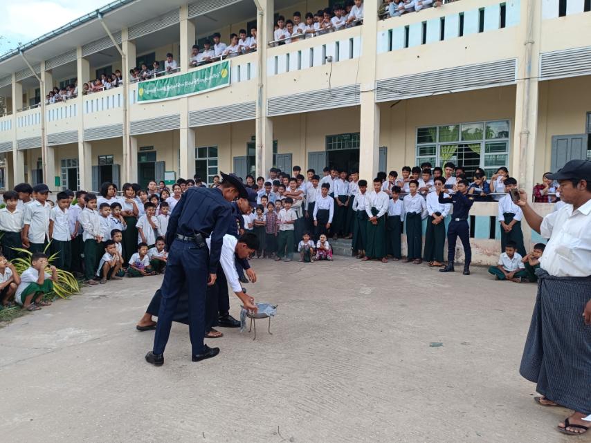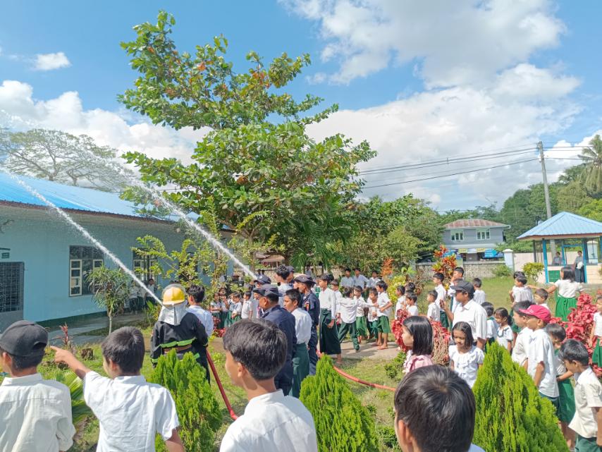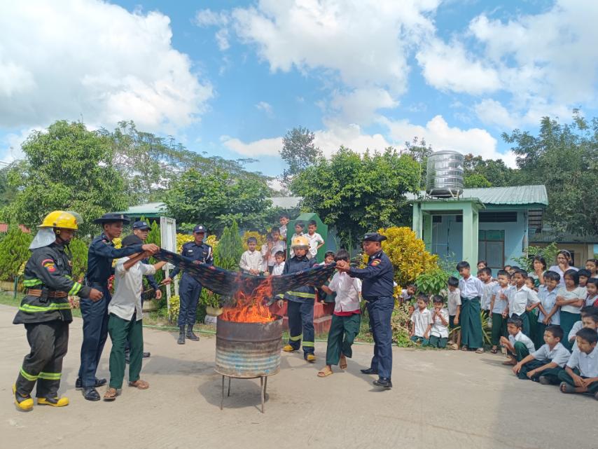 ထို့နောက် မြို့နယ်မီးသတ်ဦးစီးမှူးနှင့် မီးသတ်တပ်ဖွဲ့ဝင်များ၊ ရပ်/ ကျေးအုပ်ချုပ်ရေးမှူး၊ ကျောင်းအကျိုးတော်ဆောင်များက အခြေခံပညာအထက်တန်းကျောင်းရှိ ဆရာ၊ ဆရာမများနှင့် ကျောင်းသား၊ ကျောင်းသူ စုစုပေါင်း(၂၅၀)ဦးတို့နှင့်အတူ မီးသတ်ဆေးဗူးကိုအသုံးပြု၍ မီးငြိမ်းသတ်နည်း၊ ရေစိုအဝတ်ဖြင့် ဖုံးအုပ်ငြိမ်းသတ်နည်းနှင့် မီးငြိမ်းသတ်ယာဉ်များဖြင့် မီးငြိမ်းသတ်နည်းများကို လက်တွေ့သရုပ်ပြသလေ့ကျင့်ပေးခဲ့ကြရာ ကျောင်းသား၊ ကျောင်းသူများက စိတ်ပါဝင်စားစွာဖြင့်ပူးပေါင်းပါဝင် လေ့ကျင့်ခဲ့ကြကြောင်း သိရသည်။