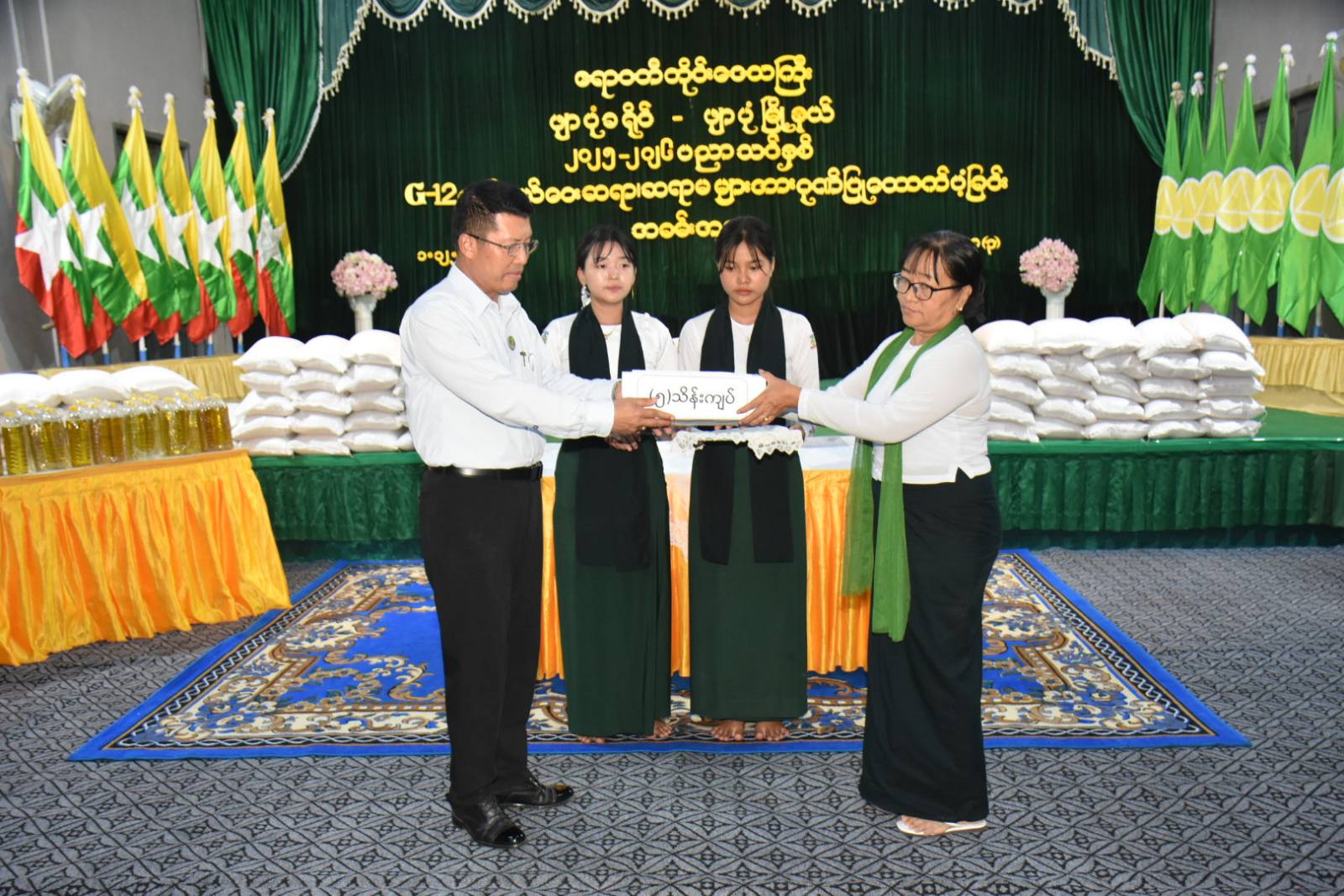 ဧရာဝတီတိုင်းဒေသကြီး၊ ဖျာပုံမြို့၊ အမှတ်(၃) အခြေခံပညာအထက်တန်းကျောင်း မြမဉ္ဇူခန်းမတွင် ၂၀၂၅-၂၀၂၆ပညာသင်နှစ်၊ Grade-12 သင်ဆရာ၊ ဆရာမများ၊ ကျောင်းသားကျောင်းသူများနှင့်တွေ့ဆုံပွဲအခမ်းအနားကို ယမန်နေ့ညနေပိုင်းက ပြုလုပ်ခဲ့ရာ တိုင်းဒေသကြီးဝန်ကြီးချုပ် ဦးတင်မောင်ဝင်းသည် တာဝန်ရှိသူများနှင့်အတူ တက်ရောက်၍ Grade-12 သင် နယ်ဝေးဆရာ၊ ဆရာမများအား ဆန်၊ ဆီနှင့် ချီးမြှင့်ငွေများပေးအပ်ခဲ့သည်။ တာဝန်ရှိသူများနှင့်အတူ တက်ရောက်၍ Grade-12 သင် နယ်ဝေးဆရာ၊ ဆရာမများအား ဆန်၊ ဆီနှင့် ချီးမြှင့်ငွေများ ပေးအပ်ခဲ့သည်။