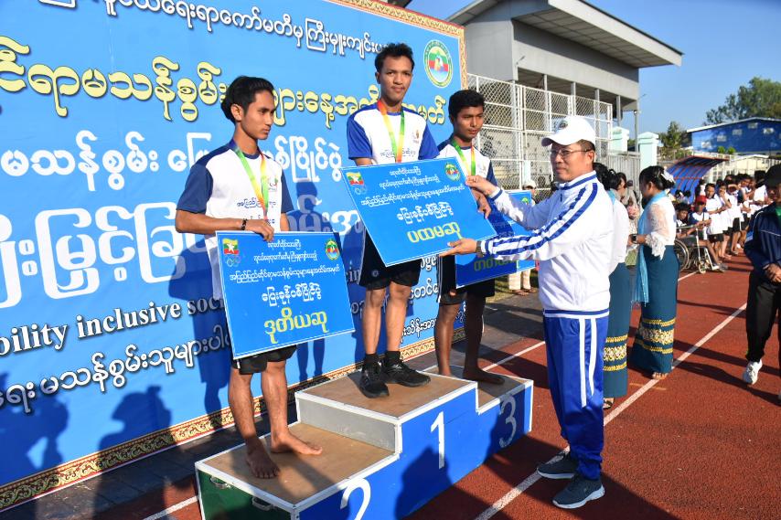 ထို့နောက် မသန်စွမ်းပြေးခုန်ပစ်ပြိုင်ပွဲ ဆုချီးမြှင့်ပွဲအခမ်းအနားကို ဆက်လက်ပြုလုပ်ရာ မသန်စွမ်း အမျိုး သမီးမီတာ(၁၀၀)အပြေးပြိုင်ပွဲတွင် ပထမ၊ ဒုတိယနှင့် တတိယဆုရရှိသူများအား တစ်ဦးချင်းဆုတံဆိပ်များနှင့် ငွေသားဆုများကို စီးပွားရေးရာဝန်ကြီး၏ ဇနီးနှင့်တိုင်းဒေသကြီး တရားသူကြီးချုပ်ကလည်းကောင်း၊ မသန်စွမ်းအမျိုးသားမီတာ(၁၀၀)ပြိုင်ပွဲတွင် ပထမ၊ ဒုတိယနှင့် တတိယဆုရရှိသူများအား တစ်ဦးချင်းဆုတံဆိပ်များနှင့် ငွေသားဆုများကို လူမှုရေးရာဝန်ကြီး ကလည်းကောင်း၊ မသန်စွမ်းအမျိုးသားသံလုံးပစ်ပြိုင်ပွဲတွင် ပထမ၊ ဒုတိယနှင့် တတိယဆုရရှိ သူများအား တစ်ဦးချင်းဆုတံဆိပ်များနှင့် ငွေသားဆုများကို သယံဇာတရေးရာဝန်ကြီးကလည်း ကောင်း၊ မသန်စွမ်းအမျိုးသားသံပြားပစ်ပြိုင်ပွဲတွင် ပထမ၊ ဒုတိယနှင့် တတိယဆုရရှိ သူများအား တစ်ဦးချင်းဆုတံဆိပ်များနှင့် ငွေသားဆုများကိုလုံခြုံရေးနှင့်နယ်စပ်ရေးရာဝန်ကြီးကလည်းကောင်း ဆုများချီးမြှင့်ခဲ့ကြပြီးနောက် မသန်စွမ်းအမျိုးသမီးသံလုံးပစ်ပြိုင်ပွဲ၊ သံပြားပစ်ပြိုင်ပွဲများတွင် ပထမ၊ ဒုတိယတိယနှင့် တတိယဆုရရှိသူများကို တစ်ဦးချင်းဆုတံဆိပ်များနှင့် ငွေသားဆုများကို တိုင်းဒေသကြီးဝန်ကြီးချုပ်၏ ဇနီးကလည်းကောင်း၊ အမျိုးသားမသန်စွမ်း အပြေးပြိုင်ပွဲတွင် ပထမ၊ ဒုတိယနှင့် တတိယဆုရရှိသူများအား တစ်ဦးချင်းဆုတံဆိပ်များနှင့် ငွေသားဆုများကို တိုင်းဒေသကြီး ဝန်ကြီးချုပ်ကလည်းကောင်း ဆုများဆက်လက်ချီးမြှင့်ခဲ့ကြပြီး မသန်စွမ်းအားကစားသမားများ နှင့်အတူ စုပေါင်းမှတ်တမ်းတင် ဓာတ်ပုံများရိုက်ကူးခဲ့ကြသည်။ ယင်းနောက် တိုင်းဒေသကြီး ဝန်ကြီးချုပ်နှင့် ဇနီးသည်ဧရာဝတီတိုင်းဒေသကြီး လူငယ်ရေးရာကော်မတီမှ ကြီးမှူးကျင်းပသည့် အပြည်ပြည်ဆိုင်ရာ မသန်စွမ်းသူများနေ့အထိမ်းအမှတ်မသန်စွမ်းပြေးခုန်ပစ်ပြိုင်ပွဲတွင် ပါဝင်ယှဉ်ပြိုင်ခဲ့ကြသည့် မသန်စွမ်းအားကစားသမားများအား ဂုဏ်ပြုဆုငွေများအသီးသီးချီးမြှင့်ခဲ့ကြသည်။