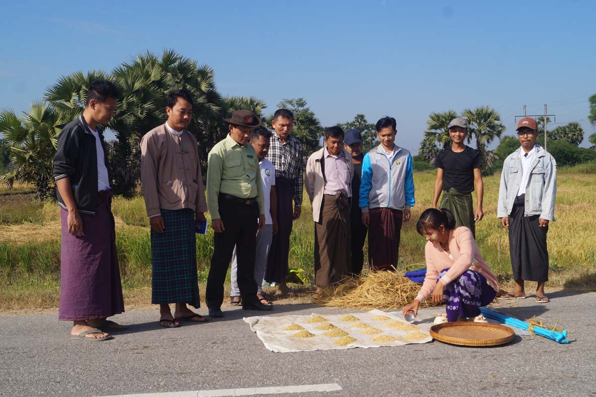 မန္တလေးတိုင်းဒေသကြီး ငါန်းဇွန်မြို့နယ် ရွာသစ်ကျေးရွာအုပ်စု ကွင်းအမှတ် (၉၁၅/၁၅၄၈) ရှိ တောင်သူ ဦးကြည်တင်၏ မိုးစပါး (မနောသုခ) စိုက်ခင်းတွင် ၂၀၂၅-၂၀၂၆ ခုနှစ် အထွက်နှုန်း မှန်ကန်စေရေးအတွက် ယနေ့နံနက် ၉ နာရီက မိုးစပါးစံကွက်ရိတ်သိမ်းခြင်း ဆောင်ရွက်ခဲ့ကြောင်း သိရသည်။