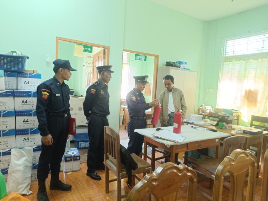 ထိုသို့ဆောင်ရွက်ရာတွင် မြို့နယ်မီးသတ်ဦးစီးမှူး ဦးထွန်းထွန်းဝင်းနှင့်သန္ဓေတပ်ဖွဲ့ဝင်များ၊ အရန်မီးသတ်တပ်ဖွဲ့ဝင်များက မီးဘေးကြိုတင်ကာကွယ်ရေးဆောင်ရွက်ထားရှိမှုများကို ကြည့်ရှုစစ်ဆေးပြီး မြို့နယ်ရွေးကောက်ပွဲ ကော်မရှင်အဖွဲ့ခွဲရုံးမှ ဦးစီးအရာရှိ ဦးအောင်ကျော်စိုးနှင့်ဝန်ထမ်းများအား မီးသတ်ဆေးဘူး အသုံးပြုနည်းများ ပြသပေးခြင်း၊ ရုံးပတ်ဝန်းကျင်ကို အမှိုက်များ ကင်းစင်အောင် ဆောင်ရွက်ထားကြရန်နှင့်မီးဘေးလုံခြုံရေးဆိုင်ရာ အကြံပြုချက်များ အသိပညာပေးခြင်းတို့ ဆောင်ရွက်ခဲ့ကြောင်း သိရသည်။