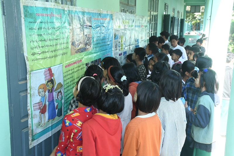 အသိပညာပေးဟောပြောပွဲအပြီးတွင် ကျောင်းသား၊ ကျောင်းသူများက ခရိုင်ပြန်ကြားရေးနှင့်ပြည်သူ့ဆက်ဆံရေးဦးစီးဌာနမှ ပြသထားသည့် ကလေးအလုပ်သမားပပျောက်ရေး၊ သဘာဝဘေးအန္တရာယ်ကြိုတင်ကာကွယ်ရေး အသိပညာပေး နံရံကပ်စာစောင်များအား စိတ်ဝင်စားစွာ ကြည့်ရှုခဲ့ကြောင်း သိရသည်။