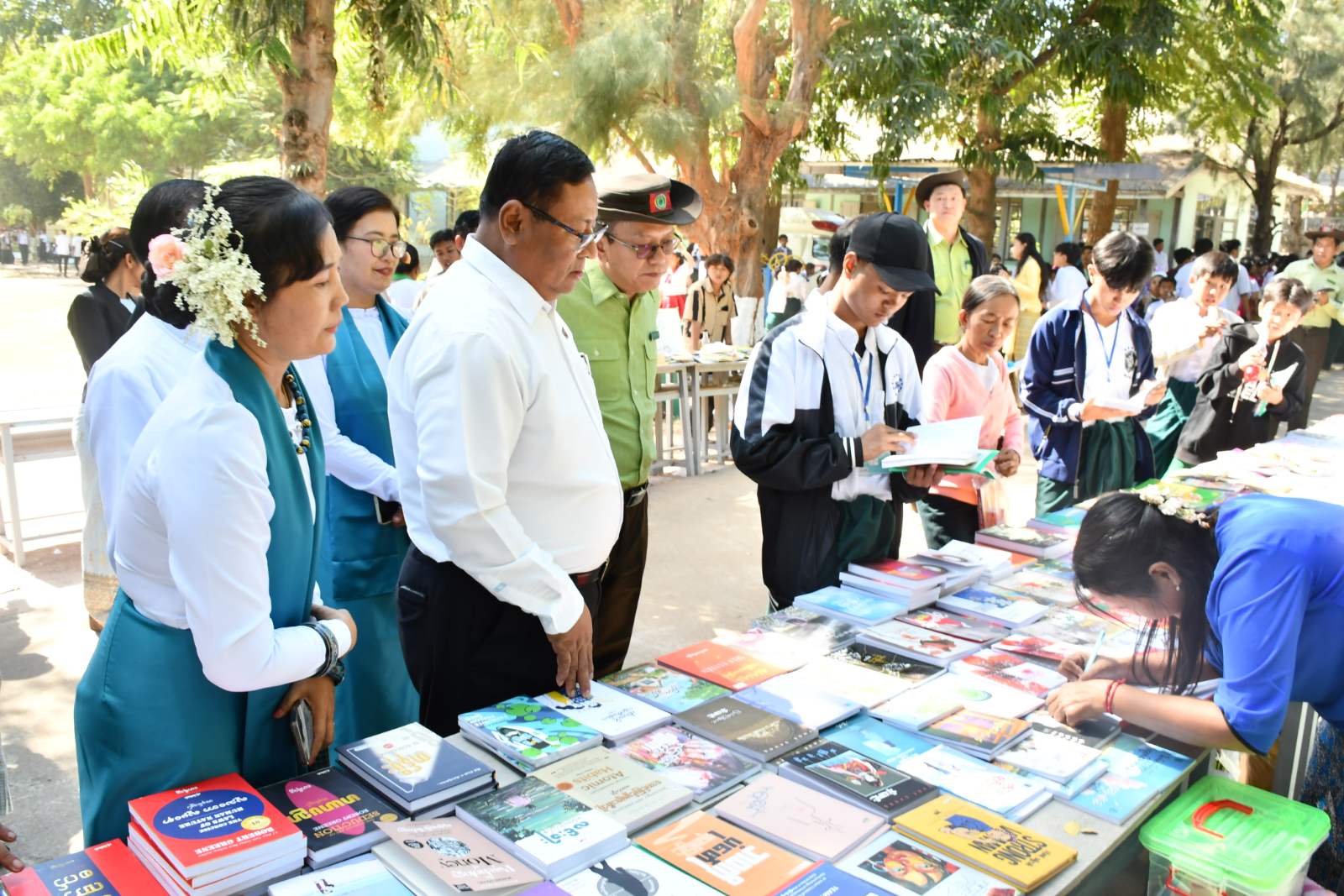 ယင်းနောက် တိုင်းဒေသကြီး လူမှုရေးရာဝန်ကြီးနှင့် တာဝန်ရှိသူများသည် ကျောင်းဝန်းအတွင်း ခင်းကျင်းပြသထားသည့် လှပသာယာပြည်မြန်မာ ရောင်စုံဓာတ်ပုံပြပွဲ၊ ကလေးစာဖတ်ခန်း၊ ပုံပြင်ပြောပြိုင်ပွဲ၊ ကျပန်းစကားပြောပြိုင်ပွဲ၊ လူငယ်စကားဝိုင်း၊ ကျောင်းစာကြည့် တိုက်များနှင့် ဌာနဆိုင်ရာပြခန်းများ၊ အသေးစားနှင့်အလတ်စား စီးပွားရေးလုပ်ငန်းပြခန်းများကို လှည့်လည်ကြည့်ရှုကြရာ တိုင်းဒေကြီးဦးစီးမှူး ဒေါ်ဝေဝေဖြိုးနှင့်တာဝန်ရှိသူများက လိုက်လံရှင်းလင်းပြသကြသည်။