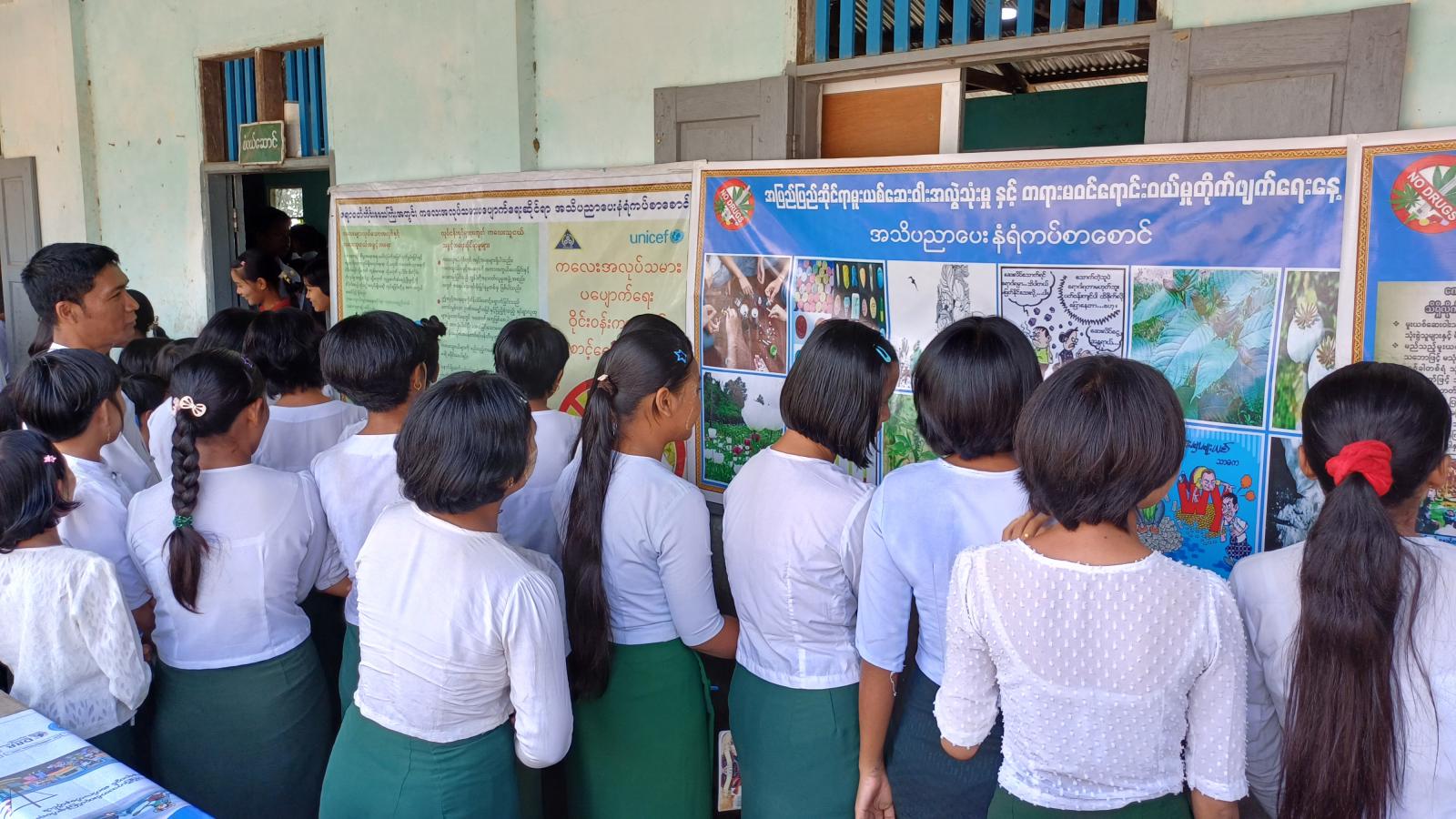 ထို့နောက် ဖျာပုံခရိုင် ပြန်ကြားရေးနှင့်ပြည်သူ့ဆက်ဆံရေးဦးစီးဌာနက ခင်းကျင်းပြသထားသောစာအုပ်စာစောင်နှင့် ကလေးအလုပ်သမားပပျောက်ရေး၊ မီးခိုးမြူငွေ့အန္တရာယ် ဝိုင်းဝန်းစုပေါင်း ဒို့ကာကွယ်၊ မူးယစ်ဆေးဝါး၏ ဆိုးကျိုးအန္တရာယ်များအကြောင်း အသိပညာပေးနံရံကပ်စာစောင်များ ပြသမှုများအား ကျောင်းသား၊ ကျောင်းသူများက စိတ်ပါဝင်စားစွာလေ့လာကြည့်ရှုခဲ့ကြသည်။