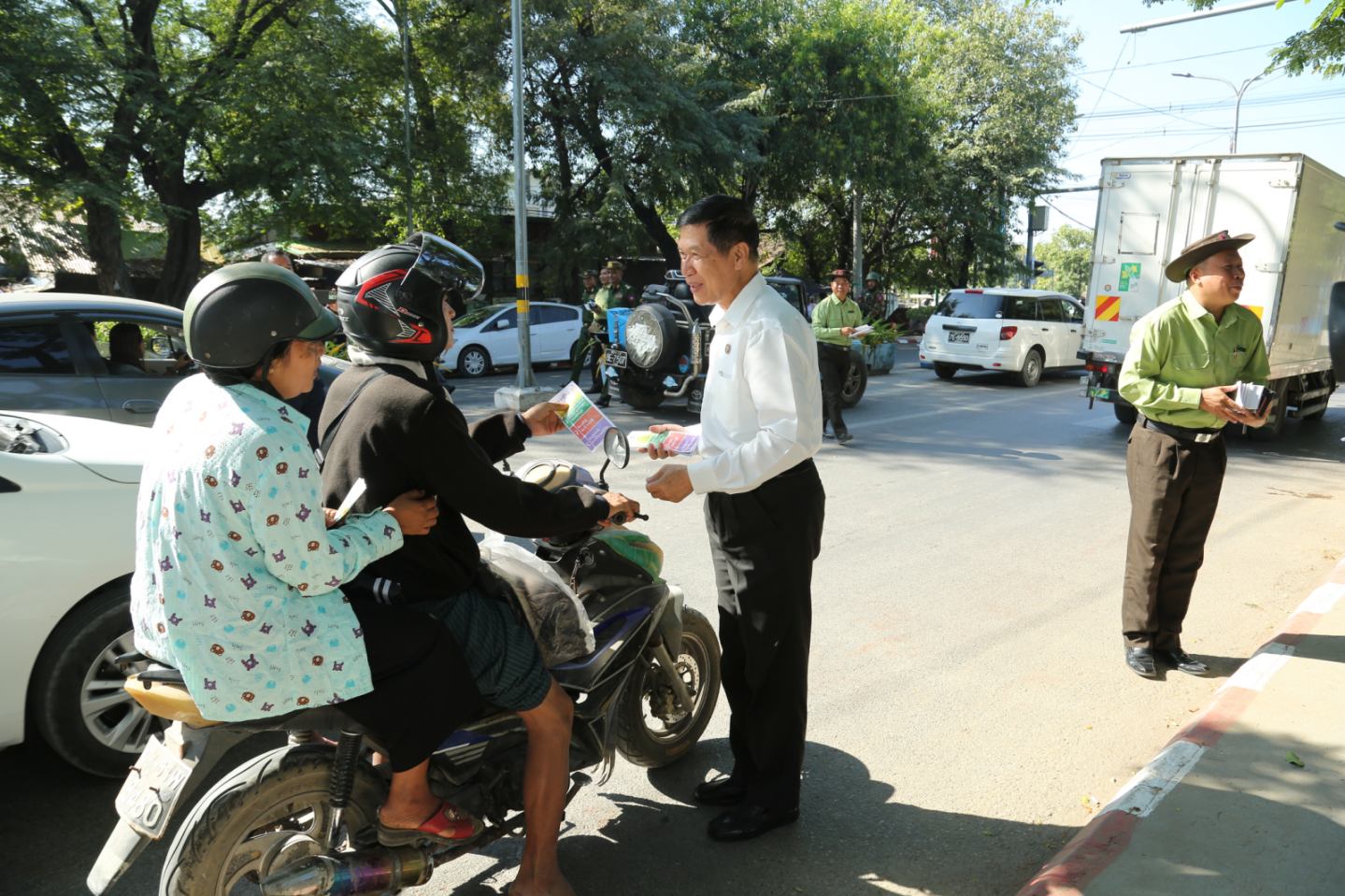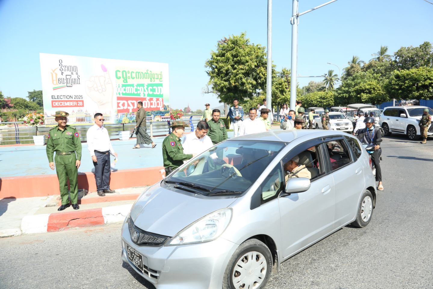 ထိုသို့ဆောင်ရွက်ရာသို့ မန္တလေးတိုင်းဒေသကြီးအစိုးရအဖွဲ့ဝန်ကြီးချုပ် ဦးမျိုးအောင်၊ အလယ်ပိုင်းတိုင်းစစ်ဌာနချုပ် တိုင်းမှူး ဗိုလ်မှူးချုပ် တင်မင်းလတ်၊ တိုင်းဒေသကြီးအစိုးရအဖွဲ့ဝင် ဝန်ကြီးများနှင့် အတွင်းရေးမှူး၊ တာဝန်ရှိသူများသည် ၂၀၂၅ ခုနှစ်၊ ပါတီစုံဒီမိုကရေစီ အထွေထွေရွေးကောက်ပွဲအား နိုင်ငံသူ၊ နိုင်ငံသားအားလုံး ပါဝင်မဲပေးနိုင်ရေးအတွက် ရွေးကောက်ပွဲနှိုးဆော်အသိပညာပေးဆိုင်ရာ လက်ကမ်းစာစောင် ကန်ပိန်းပြုလုပ်နေသော အောင်မြေသာစံမြို့နယ်၊ ၁၉ လမ်းနှင့် ၆၆ လမ်းထောင့်သို့လည်းကောင်း၊ ၂၆လမ်းနှင့် ၆၆ လမ်းထောင့်သို့လည်းကောင်း သွားရောက်ကြည့်ရှုအားပေး၍ လမ်းသွား၊ လမ်းလာပြည်သူများအား ဒို့အတူတူမဲပေးကြမယ်၊ရွေးကောက်ပွဲမှသည် ပိုမိုကောင်းမွန်သော အနာဂတ်ဆီသို့ လက်ကမ်းစာစောင်များကို ဖြန့်ဝေပေးကြသည်။