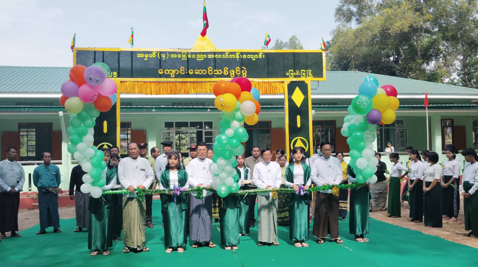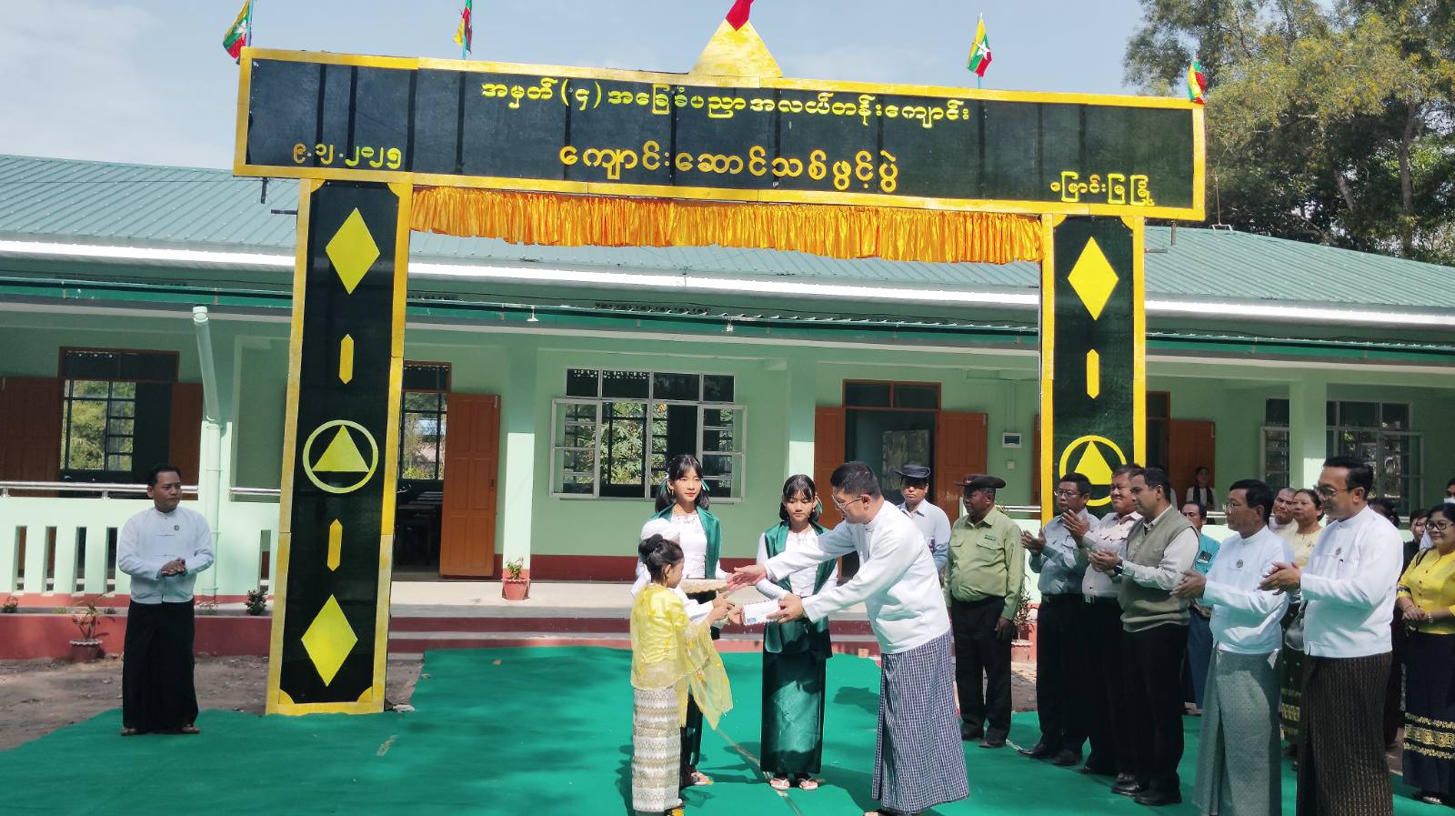 အခမ်းအနားသို့ တက်ရောက်လာသော တိုင်းဒေသကြီးအစိုးရအဖွဲ့ ဝန်ကြီးချုပ် ဦးတင်မောင်ဝင်းနှင့် အဖွဲ့များအား ဘင်ခရာအဖွဲ့၊ ပန်းပွားအဖွဲ့၊ ဒုံးယိမ်းအကအဖွဲ့နှင့် ကျောင်းသား/သူများက ကြိုဆိုနုတ်ဆက်ခဲ့ကြသည်။ ထို့နောက် ကျောင်းဆောင်သစ်အား အစိုးရအဖွဲ့ဝန်ကြီးချုပ်နှင့် အဖွဲ့ဝင်များက ဖဲကြိုးဖြတ်ဖွင့်လှစ်ပေးခဲ့ပြီးနောက် ကြိုဆိုဧည့်ခံခဲ့ကြသည့် အဖွဲ့များအား ဂုဏ်ပြုဆုချီးမြှင့်ပေးခဲ့သည်။ ဆက်လက်၍ ကျောင်းဆောင်သစ်အားပညာရေးဌာနသို့ လွှဲပြောင်းပေးအပ်ခဲ့ပြီး အစိုးရအဖွဲ့ဝန်ကြီးချုပ်နှင့် အဖွဲဝင်များက ကျောင်းဆောင်သစ်အား လှည့်လည်ကြည့်ရှုခဲ့ကြသည်။