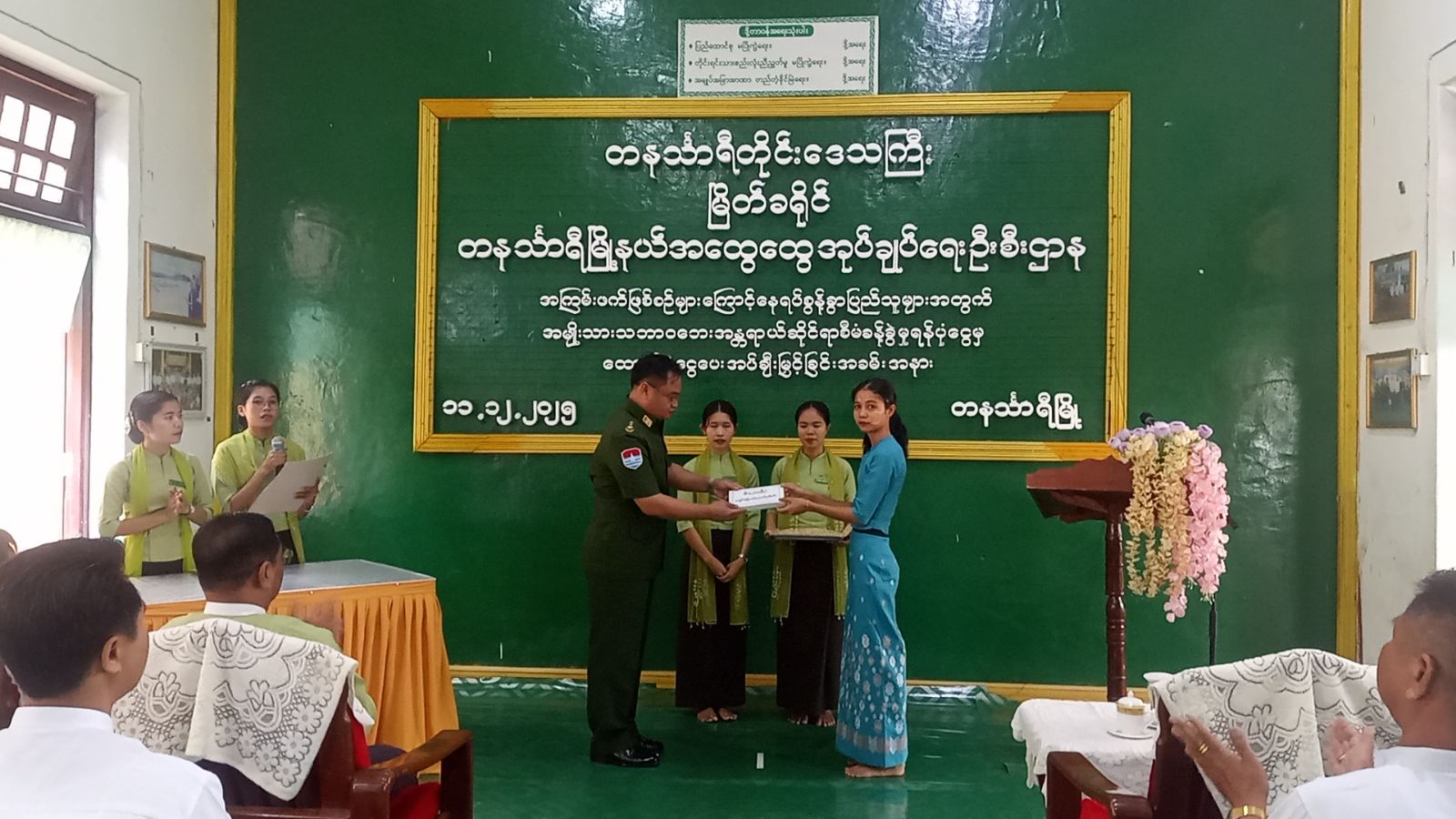 တနင်္သာရီတိုင်းဒေသကြီး တနင်္သာရီမြို့နယ်တွင် ယာယီနေရပ်စွန့်ခွာပြည်သူများအတွက် အမျိုးသားသဘာဝဘေးအန္တရာယ်ဆိုင်ရာ စီမံခန့်ခွဲမှုရန်ပုံငွေမှ ချီးမြှင့်ငွေပေးအပ်ခြင်းအခမ်းအနားကို ယနေ့နံနက်(၁၀)နာရီအချိန်က မြို့နယ်အထွေထွေအုပ်ချုပ်ရေးဦးစီးဌာန အစည်းအဝေးခန်းမ၌ ကျင်းပပြုလုပ်ခဲ့သည်။