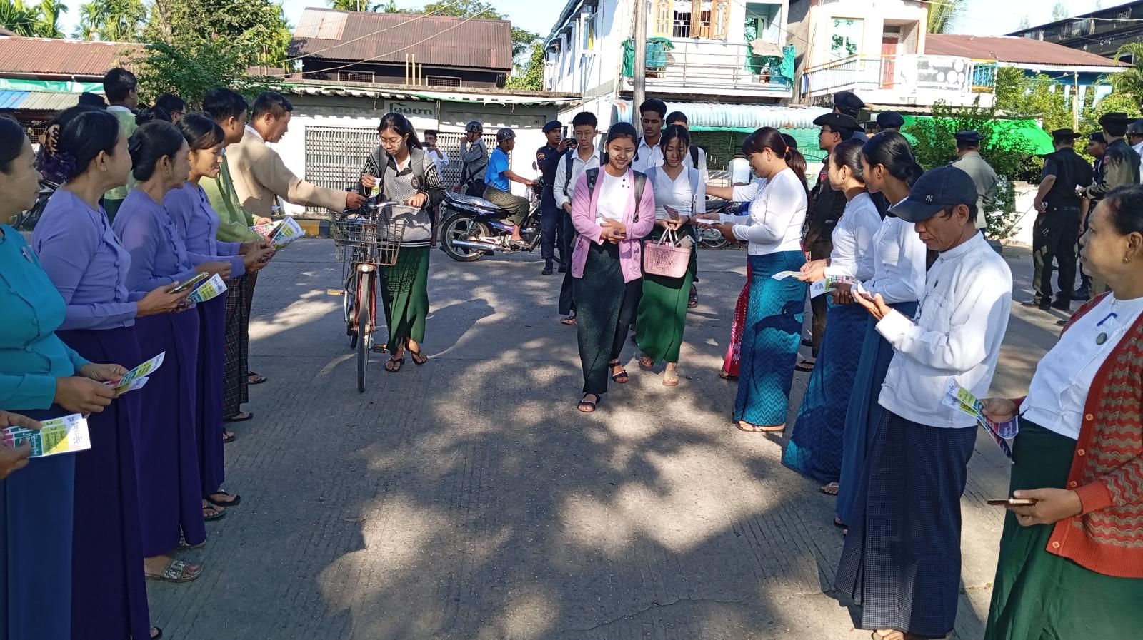 အဆိုပါလက်ကမ်းစာစောင်များ ဖြန့်ဝေခြင်းကို မြို့နယ်စီမံခန့်ခွဲရေးနှင့် အုပ်ချုပ်ရေးကော်မတီဥက္ကဋ္ဌ ဦးမြသိန်းမောင်နှင့်အဖွဲ့ဝင်များ၊ မြို့နယ်ပြန်ကြားရေးနှင့် ပြည်သူ့ဆက်ဆံရေးဦးစီးဌာနမှူး၊ ဒေါ်မြင့်မြင့်ခိုင်နှင့်ဝန်ထမ်းများ၊ ဌာနဆိုင်ရာများနှင့် လူမှုရေးအသင်းအဖွဲ့များက “ဒို့အတူတူ မဲပေးကြမယ်” ရွေးကောက်ပွဲမှသည် ပိုမိုကောင်းမွန်သော အနာဂတ်ဆီသို့၊ ဒီမိုကရေစီကို ပြန်လည်ဖော်ဆောင်ဖို့အတွက် ရွေးကောက်ပွဲမှလွဲ၍ အခြားနည်းမရှိပါ၊ ပြည်သူများလိုလားသည့် ဒီမိုကရေစီနိုင်ငံတော်ကို ရွေးကောက်ပွဲဖြင့်သာ ဖော်ဆောင်နိုင်ပါသည်။ ဒီမိုကရေစီခိုင်မြဲဖို့ မဲရုံသွားပြီး မဲပေးကြပါစို့၊ နိုင်ငံတော်ဖွံ့ဖြိုးတိုးတက်ဖို့ ဦးဆောင်နိုင်သူ ရွေးချယ်ကြပါစို့စသည့် အကြောင်းအရာများပါဝင်သည့် အသိပညာပေး လက်ကမ်းစာစောင် (၁၅၀၀) အား လူစည်ကားရာနေရာများဖြစ်သည့် စျေးများ၊ စာသင်ကျောင်းများ၊ ဆိုက်ကားဂိတ်များ၊ ကားဂိတ် များနှင့် လမ်းဆုံများတွင် အခမဲ့လိုက်လံဖြန့်ဝေပေးခဲ့ကြောင်း သိရသည်။