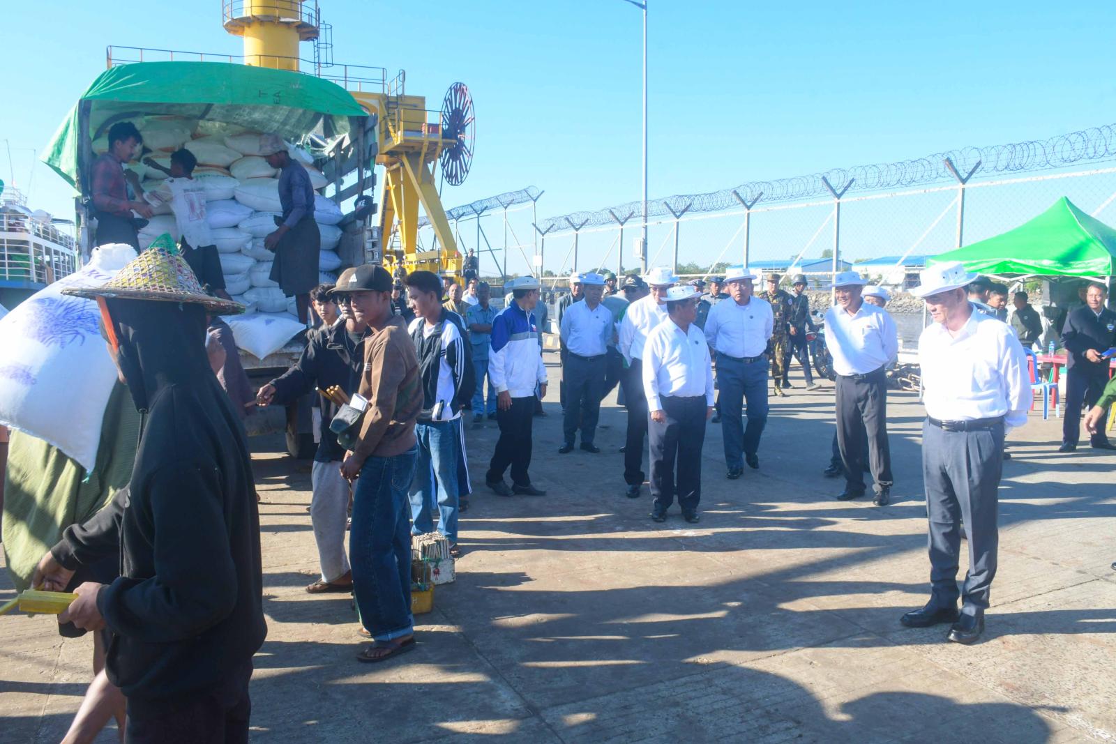 ရခိုင်ပြည်နယ်အစိုးရအဖွဲ့နှင့် ရန်ကုန်တိုင်းဒေသကြီးအစိုးရအဖွဲ့၏ စီစဉ်ကြီးကြပ်မှုဖြင့် ရခိုင်ပြည်နယ်သို့ သင်္ဘောများဖြင့် တည်ဆောက်ရေးသုံးပစ္စည်းများ၊ ဆန်နှင့်အခြေခံစားသောက်ကုန်ပစ္စည်းများကို ပို့ဆောင်ပေးလျက်ရှိရာ စစ်တွေမြို့ ဘက်စုံသုံးဆိပ်ကမ်းတွင် အမ်ဗွီမြန်မာ့အလှသင်္ဘောဖြင့် ရန်ကုန်မြို့မှ တည်ဆောက်ရေးသုံး ပစ္စည်းများ၊ အမ်ဗွီရွှေရည်ဝတ်မှုန်သင်္ဘောဖြင့် ဆန်နှင့်အခြေခံစားသောက်ကုန်ပစ္စည်းများ ရောက်ရှိလာကာ ကုန်တင်ကုန်ချပြုလုပ်နေမှုကို ရခိုင်ပြည်နယ်ဝန်ကြီးချုပ် ဦးထိန်လင်းနှင့် ပြည်နယ်အစိုးရအဖွဲ့ဝင်များ၊ ဌာနဆိုင်ရာ တာဝန်ရှိသူများက ယနေ့နံနက်ပိုင်းတွင် သွားရောက်ကြည့်ရှုစစ်ဆေးကြသည်။