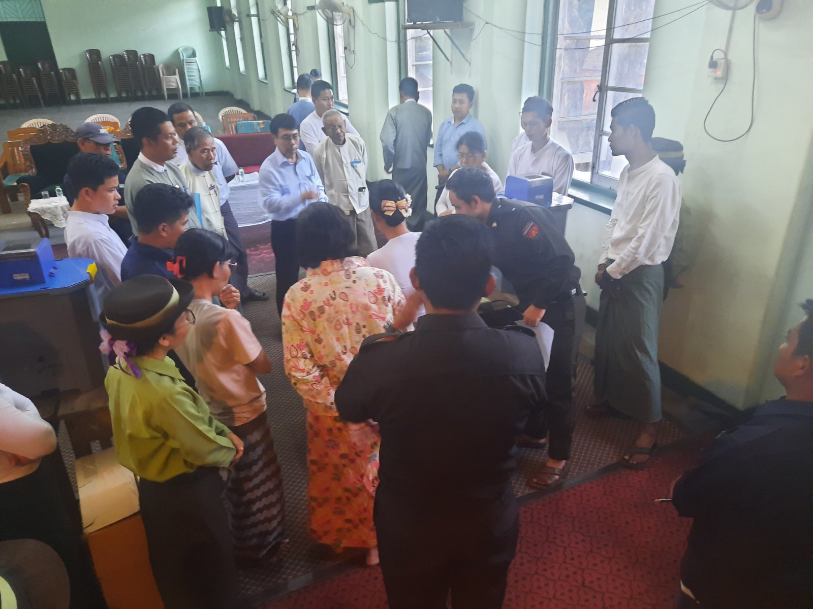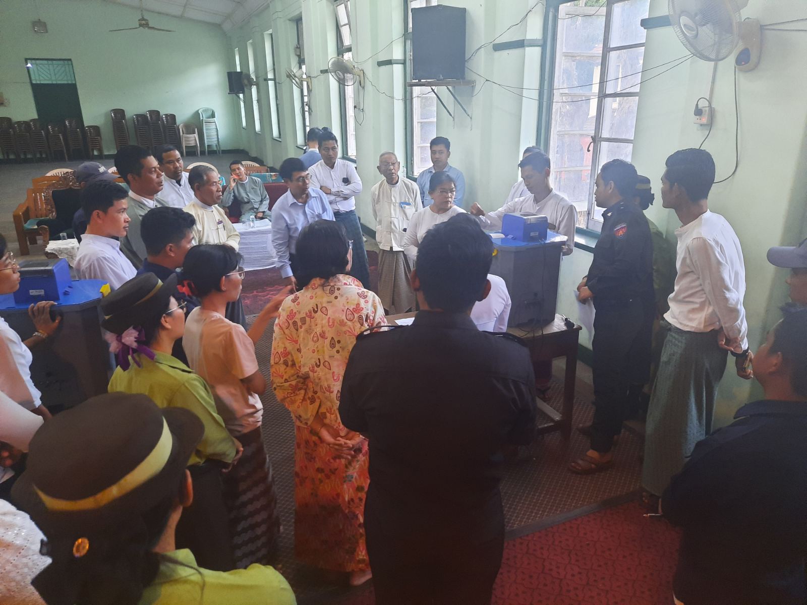 ရန်ကုန်အရှေ့ပိုင်းခရိုင်၊ ဗိုလ်တထောင်မြို့နယ်၊ အမှတ်(၁၀)ရပ်ကွက်အတွင်းရှိ အ.ထ.က(၆) ဗိုလ်တထောင်၊ အောင်ကျော်ခန်းမတွင် မြန်မာအီလက်ထရောနစ်မဲပေးစက်များ ထုတ်ယူခြင်း၊ lnstallation ပြုလုပ်ခြင်းနှင့် စက်စမ်းသပ်ခြင်း သရုပ်ပြဇာတ်တိုက်လေ့ကျင့်ခြင်းအား ဒီဇင်ဘာ ၁၁ ရက်နေ့ ညနေ ၄နာရီခွဲက ကျင်းပခဲ့သည်။