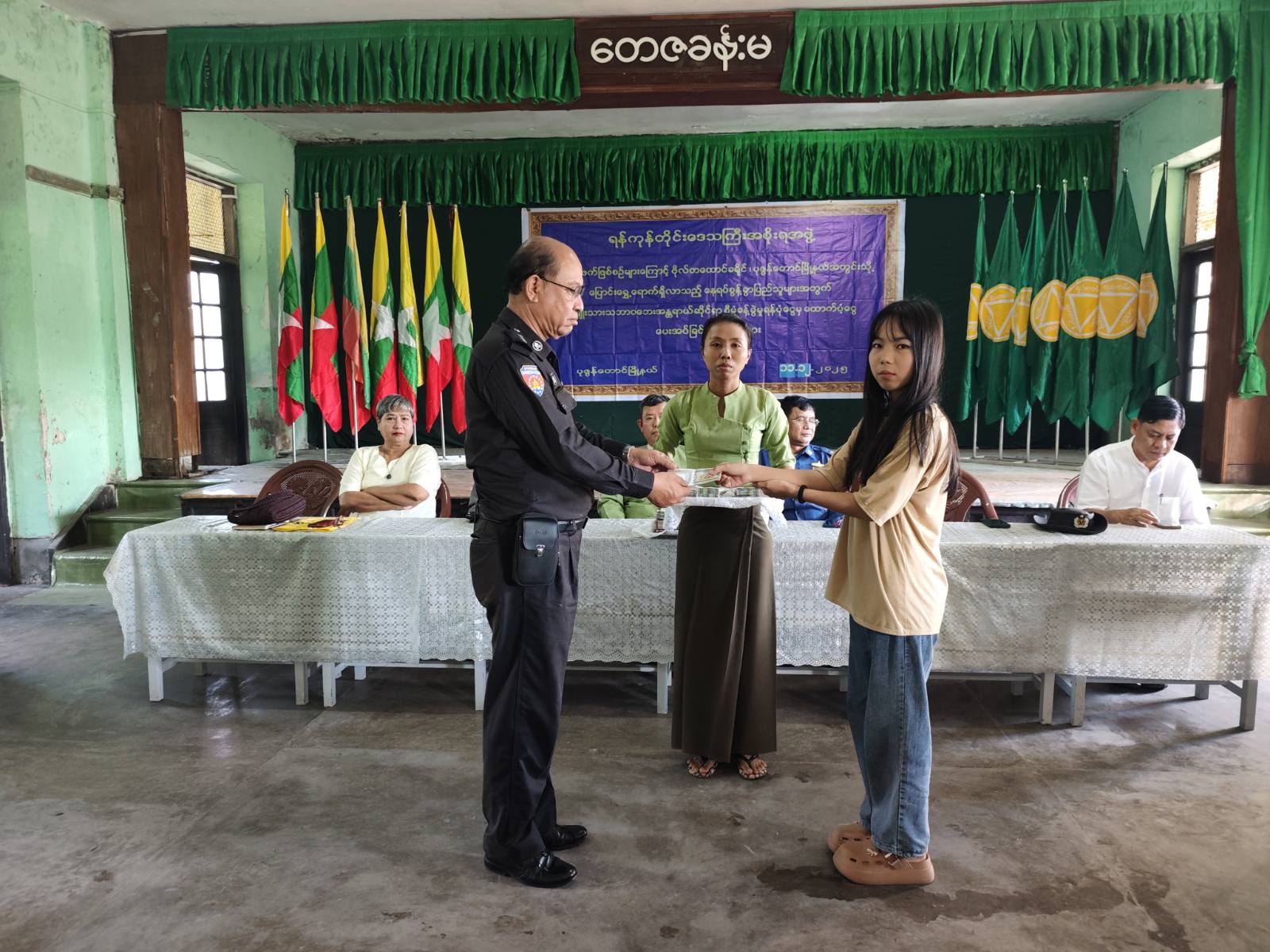 ရန်ကုန်တိုင်းဒေသကြီး၊ ဗိုလ်တထောင်ခရိုင်၊ ပုဇွန်တောင်မြို့နယ်အတွင်း ဒေသအသီးသီးမှ ယာယီနေရပ်စွန့်ခွာပြည်သူများအား အမျိုးသားသဘာဝဘေးအန္တရာယ်ဆိုင်ရာ စီမံခန့်ခွဲမှုရန်ပုံငွေမှ ၂၀၂၅ ခုနှစ်၊ ဇူလိုင်လ၊ သြဂုတ်လနှင့် စက်တင်ဘာလ (၃)လစာ အတွက် တစ်ဦးလျှင် ငွေကျပ် ၆၀,၀၀၀/ နှုန်းဖြင့် ထောက်ပံ့ငွေပေးအပ်ခြင်းအခမ်းအနားကို ယမန်နေ့ နေ့လယ် ၂ နာရီအချိန်က အမှတ်(၁၀) ရပ်ကွက်ရှိ အမှတ်(၄)အခြေခံပညာမူလတန်းကျောင်း တေဇခန်းမ၌ ကျင်းပခဲ့သည်။