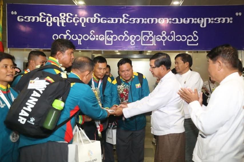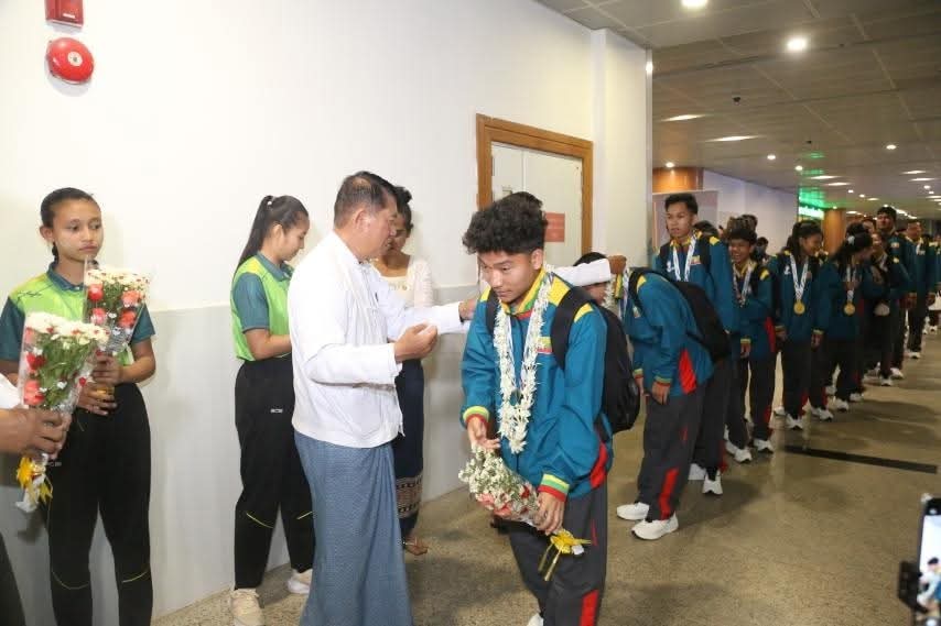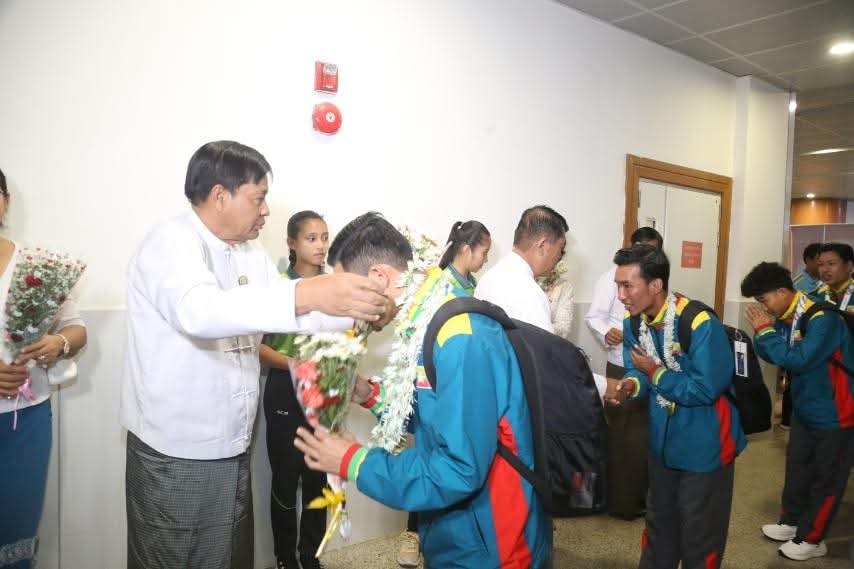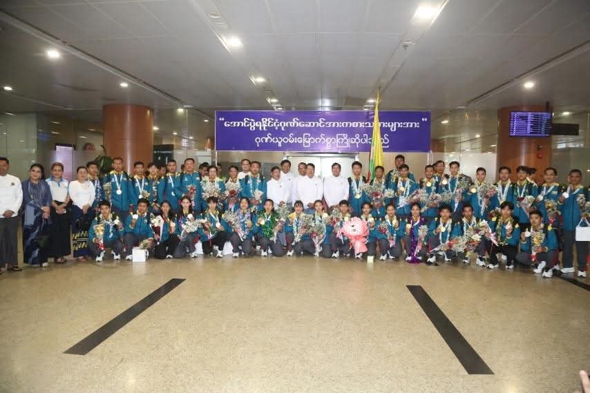 ၂၀၂၅ ခုနှစ် ဒီဇင်ဘာလ (၉)ရက်နေ့မှ (၂၀)ရက်နေ့အထိ ထိုင်းနိုင်ငံ၊ ဘန်ကောက်မြို့၌ ကျင်းပသည့် (၃၃)ကြိမ်မြောက် အရှေ့တောင်အာရှ အားကစားပြိုင်ပွဲတွင် ရွှေ၊ ငွေ၊ ကြေး အသီးသီးဆွတ်ခူးခဲ့သော ခြင်းလုံး၊ ပိုက်ကျော်ခြင်း(ကွင်းသွင်)၊ ပီတန်း၊ တိုက်ကွမ်ဒို မြန်မာအားကစားအဖွဲ့သည် ယမန်နေ့ညနေ (၁၆ : ၃၀)နာရီအချိန်တွင် လေယာဉ်အမှတ် 8M334 အပြည်ပြည်ဆိုင်ရာ မြန်မာ့လေကြောင်းလိုင်း (MAI) ဖြင့် ရန်ကုန်အပြည်ပြည်ဆိုင်ရာလေဆိပ်သို့ ပြန်လည်ရောက်ရှိလာရာ ရန်ကုန်တိုင်းဒေသကြီးအစိုးရအဖွဲ့ ဝန်ကြီးချုပ် ဦးစိုးသိန်းနှင့် အစိုးရအဖွဲ့ဝင်ဝန်ကြီးများ၊ အားကစာနှင့်ကာယပညာသိပ္ပံ(ရန်ကုန်)ကျောင်းအုပ်ကြီးနှင့် တာဝန်ရှိပုဂ္ဂိုလ်များ၊ ရန်ကုန်တိုင်းဒေသကြီး အားကစားနှင့်လူငယ်ရေးရာ အထောက်အကူပြု လုပ်ငန်းကော်မတီမှ အဖွဲ့ဝင်များ၊ မြန်မာနိုင်ငံ အားကစားအဖွဲ့ချုပ်များမှ ဥက္ကဋ္ဌများနှင့် တာဝန်ရှိသူများ၊ ပြည်ထောင်စုတိုင်းရင်းသားဖွံ့ဖြိုးရေး ဒီဂရီကောလိပ်မှ ကျောင်းအုပ်ကြီးနှင့် ကျောင်းသား၊ ကျောင်းသူများ၊ အားကစားနှင့်ကာယပညာသိပ္ပံ(ရန်ကုန်)မှ ကျောင်းသား၊ ကျောင်းသူများ၊ ပြိုင်ပွဲဝင်အားကစားသမားများ၏ မိဘဆွေမျိုးများ၊ မိဘပြည်သူများက အိုးစည်၊ ဒိုးပတ်များ၊ ပန်းစည်းများဖြင့် သောင်းသောင်းဖျဖျ ဂုဏ်ပြုကြိုဆိုခဲ့သည်။