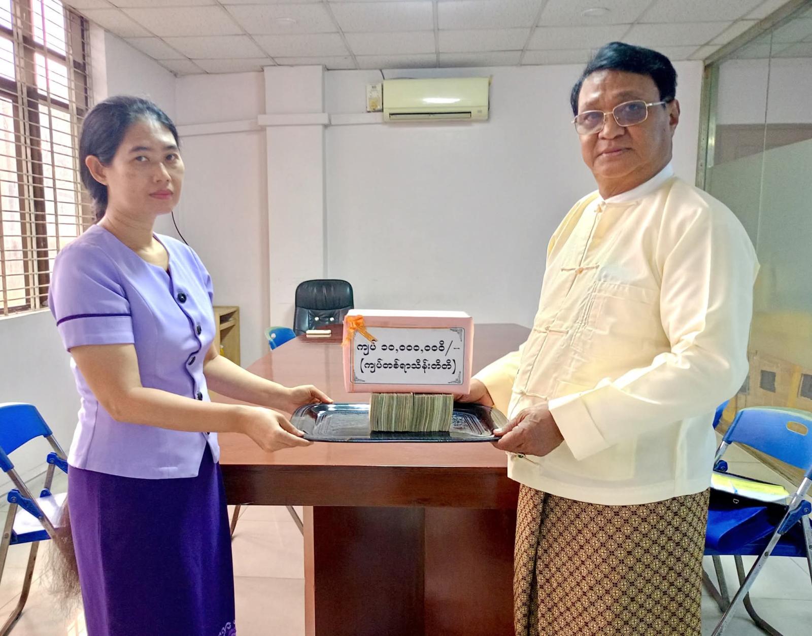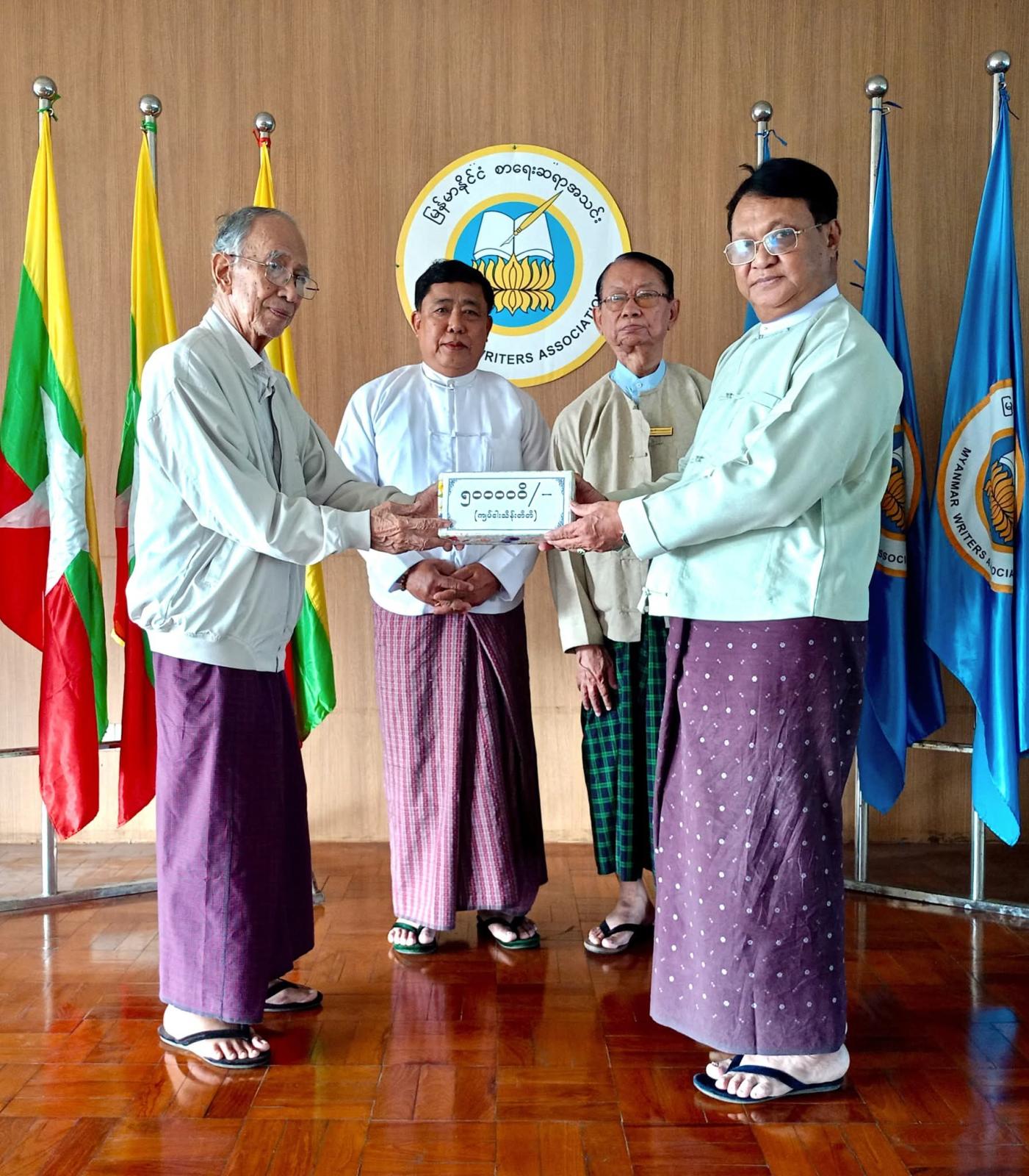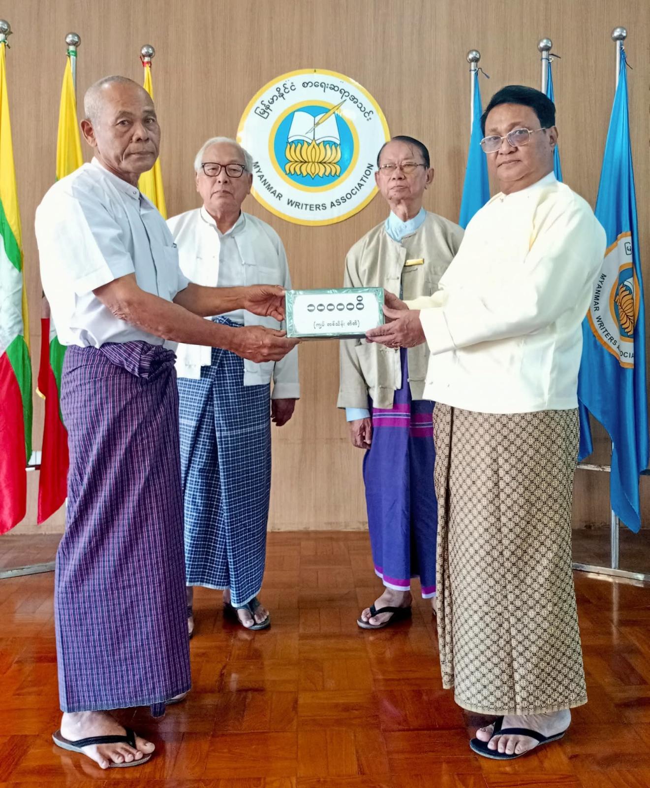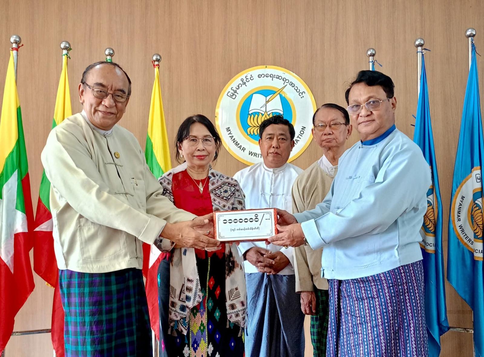 ထိုသို့လှူဒါန်းရာတွင် ပြည်ထောင်စုသမ္မတမြန်မာနိုင်ငံတော် ယာယီသမ္မတ နိုင်ငံတော်လုံခြုံရေးနှင့်အေးချမ်းသာယာရေးကော်မရှင်ဥက္ကဋ္ဌ တပ်မတော်ကာကွယ်ရေးဦးစီးချုပ် ဗိုလ်ချုပ်မှူးကြီးမင်းအောင်လှိုင်နှင့် ဇနီးဒေါ်ကြူကြူလှတို့က ငွေကျပ် (၁၄၅)သိန်းကျော် တန်ဖိုးရှိ အင်္ကျီ၊ ပုဆိုး၊ လက်ဆွဲအိတ်၊ ခြုံပဝါနှင့် ပါတိတ်လုံချည်များ၊ ဒေါက်တာခင်ခင်ရီ (ရှိုင်းဟုပ်ကုမ္ပဏီ)က အလှူငွေကျပ် သိန်း(၁၀၀)၊ ပြန်ကြားရေးဝန်ကြီးဌာနနှင့် အမျိုးသားစာပေဆုရှင် တာမိုးညဲ သီဟလွင်တို့က ငွေကျပ်သိန်း(၃၀)စီ၊ ကချင်ပြည်နယ်အစိုးရအဖွဲ့က ငွေကျပ်သိန်း(၂၀)၊ နေပြည်တော်ကောင်စီက ငွေကျပ် (၁၇၆၀၀၀၀)၊ ဒေါက်တာတင်ထွန်းဦး-ဒေါက်တာခင်မိုးမိုး (စွယ်စုံမီဒီယာဂရု)က ငွေကျပ် (၁၁)သိန်း၊ မြန်မာနိုင်ငံသတင်းမီဒီယာကောင်စီ၊ Nation Light Company Limited နှင့် ဦးကိုကိုလတ်(ရွှေအိုလတ်)တို့က ငွေကျပ် (၁၀)သိန်းစီ၊ ဆရာကြီး ဦးညွန့်ဆွေ(မောင်ဆွေသက်)-ဆရာမကြီး သရက်မသက်ဆွေ၊ ဗိုလ်မှူးချုပ်အေးမြင့်ကြူ(ငြိမ်း) (ချစ်ဆွေမြင့်)-ပါမောက္ခဒေါက်တာခင်ဆွေမြင့် (ဆွေယင်းမာ-ရန်ကုန်တက္ကသိုလ်)တို့က ငွေကျပ်ငါးသိန်းစီ၊ ဓနုဖြူမြို့နယ်စာရေးဆရာအသင်းက ငွေကျပ်(၁၂၀၀၀၀)၊ ဦးကြည်ဝင်း(ထေရအောင်)၊ ဒဂုံမြို့သစ်(မြောက်ပိုင်း)မြို့နယ် စာရေးဆရာအသင်း၊ စမ်းချောင်းမြို့နယ် စာရေးဆရာအသင်း၊ ကျောက်တန်းမြို့နယ် စာရေးဆရာအသင်းနှင့် မိုးညှင်းမြို့နယ် စာရေးဆရာအသင်းတို့က ငွေကျပ်တစ်သိန်းစီ၊ မမိုးအေး(ကိုယ်တိုင်ရေး)၊ ဒေါက်တာဗိုလ်သံမဏိ(တောင်တွင်းကြီး)နှင့် ဒဂုံမြို့နယ် စာရေးဆရာအသင်းတို့က ငွေကျပ်ငါးသောင်းစီ၊ ဦးကျော်ဇေယျထွန်း(ဇေယံ)က ငွေကျပ်နှစ်သောင်း၊ ဦးထွန်းနေလင်း(သျှင်သီရိနေ)က ငွေကျပ်(၂၅၉၂၀၀၀)တန်ဖိုးရှိ စာအုပ် (၂၈၈)အုပ် အသီးသီးပေးအပ်လှူဒါန်းကြရာ အသင်းဥက္ကဋ္ဌ ဦးအုန်းမောင်(မြင်းမူမောင်နိုင်မိုး)၊ ဒုတိယဥက္ကဋ္ဌ(၁) ဦးမျိုးထွန်း (မောင်စိမ်းနောင်-လယ်ဝေး)၊ အတွင်းရေးမှူး ဦးညွန့်တင်(မောင်ငြိမ်းသူ-ကြို့ပင်ကောက်)နှင့် တာဝန်ရှိသူများက လက်ခံရယူပြီး ကျေးဇူးတင်စကား ပြန်လည်ပြောကြားသည်။