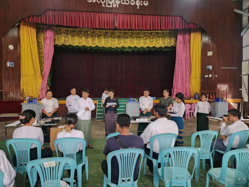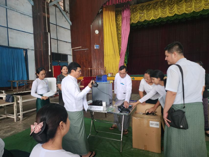 (၂၈.၁၂.၂၀၂၅)ရက်နေ့တွင် ကျင်းပပြုလုပ်မည့် ပါတီစုံဒီမိုကရေစီအထွေထွေရွေးကောက်ပွဲတွင် အသုံးပြုမည့် မြန်မာအီလက်ထရောနစ်မဲပေးစက် MEVM စက်များ ထုတ်ယူခြင်း၊ Installation ပြုလုပ်ခြင်း၊ စက်စမ်းသပ်ခြင်းနှင့် သရုပ်ပြဇာတ်တိုက်လေ့ကျင့် ဆောင်ရွက်နေမှုအား ပြည်ထောင်စုရွေးကောက်ပွဲကော်မရှင်အဖွဲ့၀င် ဦးအောင်စောဝင်း (ရန်ကုန်တိုင်းဒေသကြီးတာဝန်ခံ)၊ တိုင်းဒေသကြီး ရွေးကောက်ပွဲကော်မရှင်အဖွဲ့ခွဲ အဖွဲ့ဝင် ဒေါ်ဖြူဖြူဥ၊ ခရိုင်ရွေးကောက်ပွဲကော်မရှင်အဖွဲ့ခွဲ ဥက္ကဋ္ဌနှင့် အဖွဲ့ဝင်များ၊ မြို့နယ်စီမံခန့်ခွဲရေးနှင့်အုပ်ချုပ်ရေးကော်မတီဥက္ကဋ္ဌနှင့် အဖွဲ့ဝင်များ၊ မြို့နယ်ရွေးကောက်ပွဲကော်မရှင်အဖွဲ့ခွဲဥက္ကဋ္ဌနှင့် အဖွဲ့ဝင်များက ကြည့်ရှု့စစ်ဆေးခဲ့ကြပြီး ပြည်ထောင်စုရွေးကောက်ပွဲကော်မရှင်အဖွဲ့၀င် ဦးအောင်စောဝင်း (ရန်ကုန်တိုင်းဒေသကြီးတာဝန်ခံ)က MEVM မဲပေးစက် တပ်ဆင်အသုံးပြုခြင်းနှင့် ပတ်သက်၍ လိုအပ်သည်များ မှာကြားခဲ့သည်။