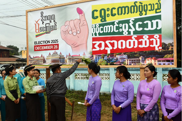 ဦးစွာ ၂၀၂၅ ခုနှစ် ပါတီစုံဒီမိုကရေစီအထွေထွေရွေးကောက်ပွဲတွင် ပြည်သူတစ်ရပ်လုံးပါဝင် မဲပေးနိုင်ရေး “ဒို့အတူတူမဲပေးကြမယ်” ရွေးကောက်ပွဲလှုံ့ဆော်ရေး မြေစိုက်ပိုစတာအား ခရိုင်စီမံခန့်ခွဲရေးနှင့်အုပ်ချုပ်ရေးကော်မတီဉက္ကဋ္ဌ ဦးညီညီထွေး၊ နယ်မြေခံတပ်နယ်မှ ဒုတိယဗိုလ်မှူးကြီး သိန်းဇော်၊ မြို့နယ်စီမံခန့်ခွဲရေးနှင့်အုပ်ချုပ်ရေးကော်မတီဥက္ကဋ္ဌ ဦးအားလွန်၊ ခရိုင်နှင့်မြို့နယ် ရွေးကောက်ပွဲကော်မရှင်အဖွဲ့ခွဲဉက္ကဋ္ဌနှင့် တာဝန်ရှိသူတို့က အမွှေးနံ့သာရေများပတ်ဖျန်းကာ စိုက်ထူ ပေးသည်။