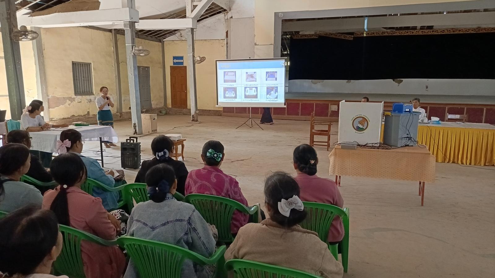 ဆက်လက်၍ မဲရုံမှူး၊ ဒုတိယမဲရုံမှူး၊ မဲရုံအဖွဲ့ဝင်များ၏ မွမ်းမံသင်တန်းအား ပို့ချခဲ့ရာ မြို့နယ်ရွေးကောက်ပွဲကော်မရှင်အဖွဲ့ခွဲရုံးမှ ဦးစီးအရာရှိ ဒေါ်ခင်စုစုနှင်းက မဲရုံမှူး၊ ဒုတိယမဲရုံမှူး၊ ရပ်ကွက်/ကျေးရွာအုပ်စုကော်မရှင်အဖွဲ့ဝင်များ၏ တာဝန်နှင့် လုပ်ပိုင်ခွင့်များ၊ မဲပေးစက်တည်ဆောက်ပုံနည်းလမ်းများ၊ စက်တပ်ဆင်ပုံ၊ စမ်းသပ်မဲပေးပုံ၊ ရွေးကောက်ပွဲနေ့တွင် မဲရုံ၌ မဲပေးစက်တပ်ဆင်ခင်းကျင်းပုံ၊ မဲရလဒ်ရေတွက်ပုံ၊ နည်းဥပဒေပါအတိုင်း မဲရလဒ်စာရင်းပြုစုပုံ၊ မဲပေးစက်အား ပြန်လည်ထုပ်ပိုးသိမ်းဆည်းပုံနှင့် ရွေးကောက်ပွဲဆိုင်ရာ သိသင့်သိထိုက်မှုများကို ဥပဒေ၊ နည်းဥပဒေ၊ လုပ်ငန်းလမ်းညွှန်ချက်များနှင့်အညီ သင်ကြားပေးသွားမည်ဖြစ်ကြောင်းနှင့် သင်တန်းသား/ သင်တန်းသူ (၅၀၀) ဦး တက်ရောက်ခဲ့ကြကြောင်း သိရသည်။