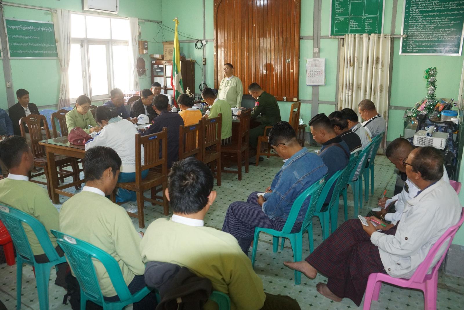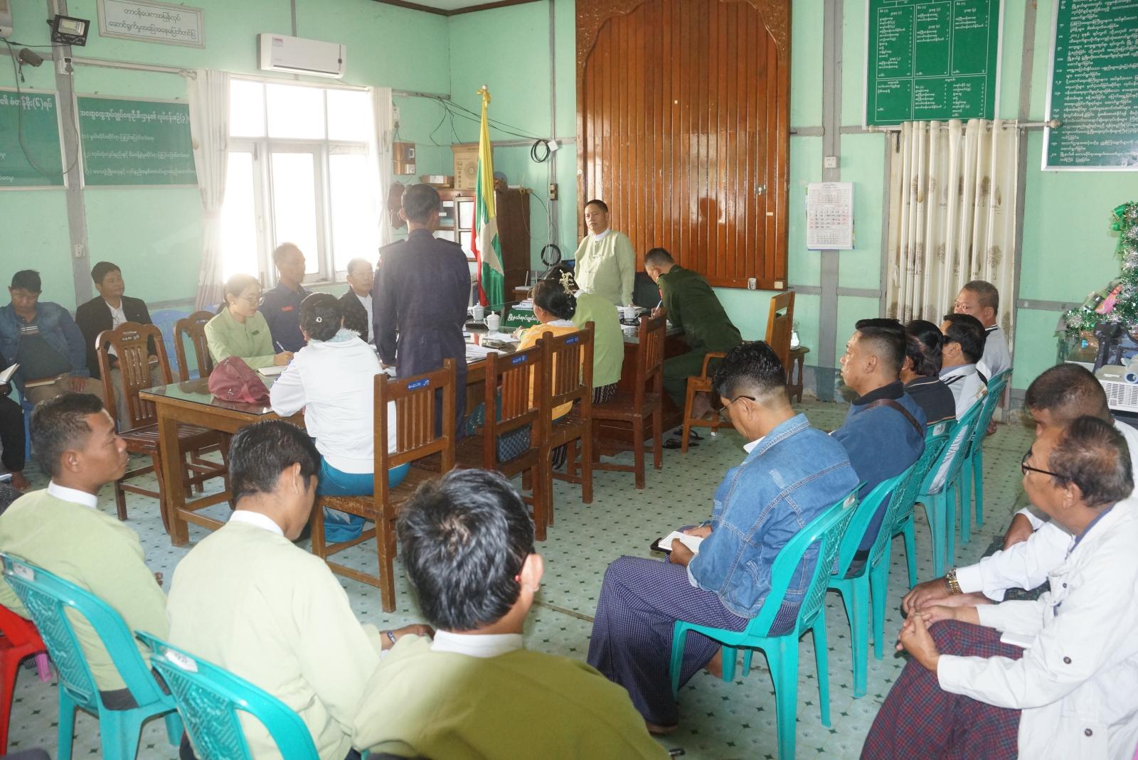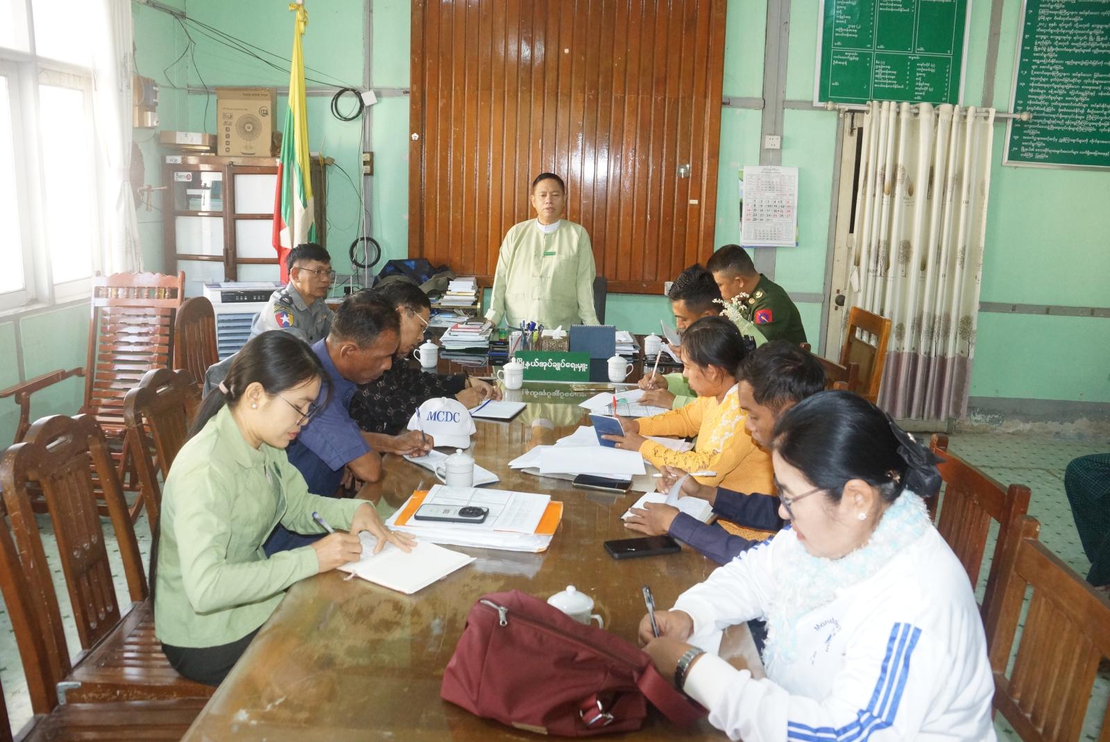 ရှေးဦးစွာ မြို့နယ်စီမံခန့်ခွဲရေးနှင့်အုပ်ချုပ်ရေးကော်မတီဥက္ကဋ္ဌ ဦးထင်ဇော်ဦးက ၂၀၂၅ ခုနှစ် ဒီဇင်ဘာ ၂၈ ရက်နေ့တွင် စတင်ကျင်းပမည့် ပါတီစုံဒီမိုကရေစီအထွေထွေရွေးကောက်ပွဲ အောင်မြင်စွာ ကျင်းပနိုင်ရေးအတွက် မဲရုံပြင်ဆင်ထားရှိရေး၊ မဲရုံပတ်ဝန်းကျင် လုံခြုံရေး နေရာချထားဆောင်ရွက်မှုများ၊ မဲပေးစက်စနစ်တကျထားရှိရေးနှင့် ဆန္ဒမဲပေးသူများ စိတ်အေးချမ်းသာစွာ မဲပေးနိုင်ရေးအတွက် မဲရုံပတ်ဝန်းကျင် အတွင်းအပြင်သန့်ရှင်းမှုရှိစေရေး အစရှိသည့်တို့ကို မိမိတို့တာဝန်ကျသည့် ရပ်ကွက်အလိုက် ဆောင်ရွက်သွားကြရန် ရှင်းလင်းပြောကြားခဲ့သည်။ ထို့နောက်အစည်းအဝေးသို့ တက်ရောက်လာကြသည့် မြို့နယ်ရွေးကောက်ပွဲကော်မရှင်အဖွဲ့ခွဲအဖွဲ့ဝင်များက မိမိတို့ ဆောင်ရွက်ရမည့် ရပ်ကွက်အလိုက် ရှင်းလင်းဆွေးနွေးတင်ပြကြရာ မြို့နယ်စီမံခန့်ခွဲရေးနှင့် အုပ်ချုပ်ရေးကော်မတီဥက္ကဋ္ဌ ဦးထင်ဇော်ဦးနှင့်အဖွဲ့ဝင်များက ပေါင်းစပ် ညှိနှိုင်းဆွေးနွေးပေးခဲ့သည်။