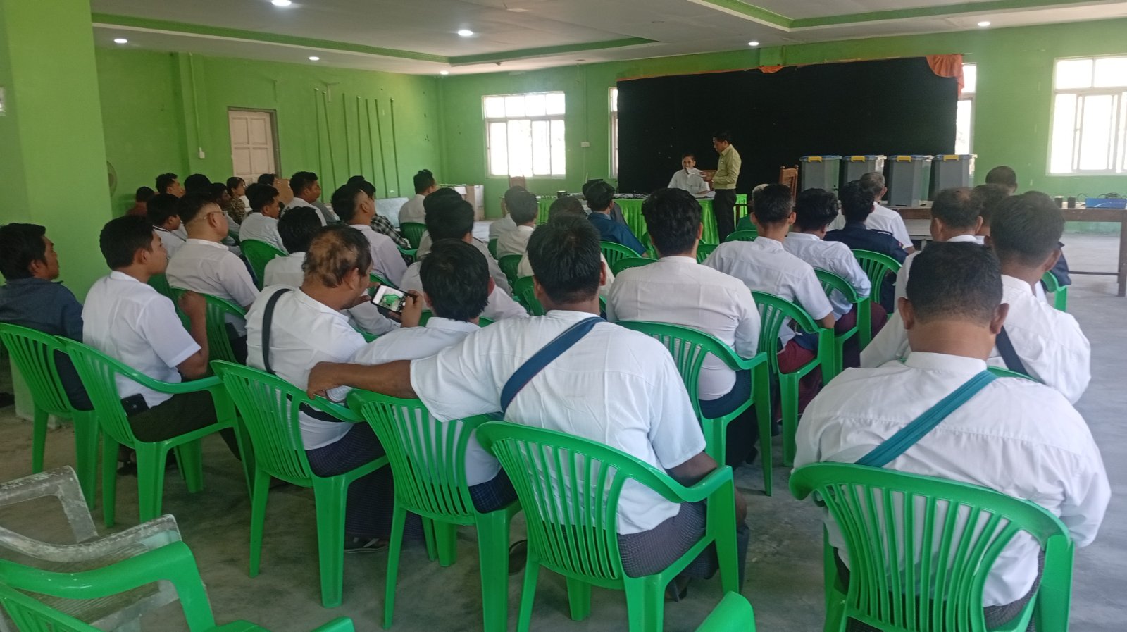 ဦးစွာ မြို့နယ်ရွေးကောက်ပွဲကော်မရှင်ဥက္ကဋ္ဌ ဦးမြင့်ဇော်နှင့် မြို့နယ်အထွေထွေအုပ်ချုပ်ရေးဦးစီးဌာနမှ ဒုတိယမြို့နယ်အုပ်ချုပ်ရေး ဦးသိန်းဇော်တို့က အမှာစကားပြောကြားပြီး သင်တန်းမြို့နယ်ကော်မရှင်ရုံးမှ ဒုတိယဦးစီးမှူး ဒေါ်စန်းစန်းစိုးက မဲပေးစက်ကိုင် တာဝန်ကျဝန်ထမ်းများ၏ တာဝန်နှင့်လုပ်ငန်းစဉ်များကို ရှင်းလင်းဆွေးနွေးပြီး မဲပေးစက်တပ်ဆင် အသုံးပြုပုံအဆင့်ဆင့်ကို အဖွဲ့လိုက်လက်တွေ့သရုပ်ပြ ရှင်းလင်းပြသသည်။ အဆိုပါသင်တန်းသို့ သင်တန်းသားသင်တန်းသူ (၅၀)ဦး တက်ရောက်ခဲ့ကြကြောင်း သိရသည်။