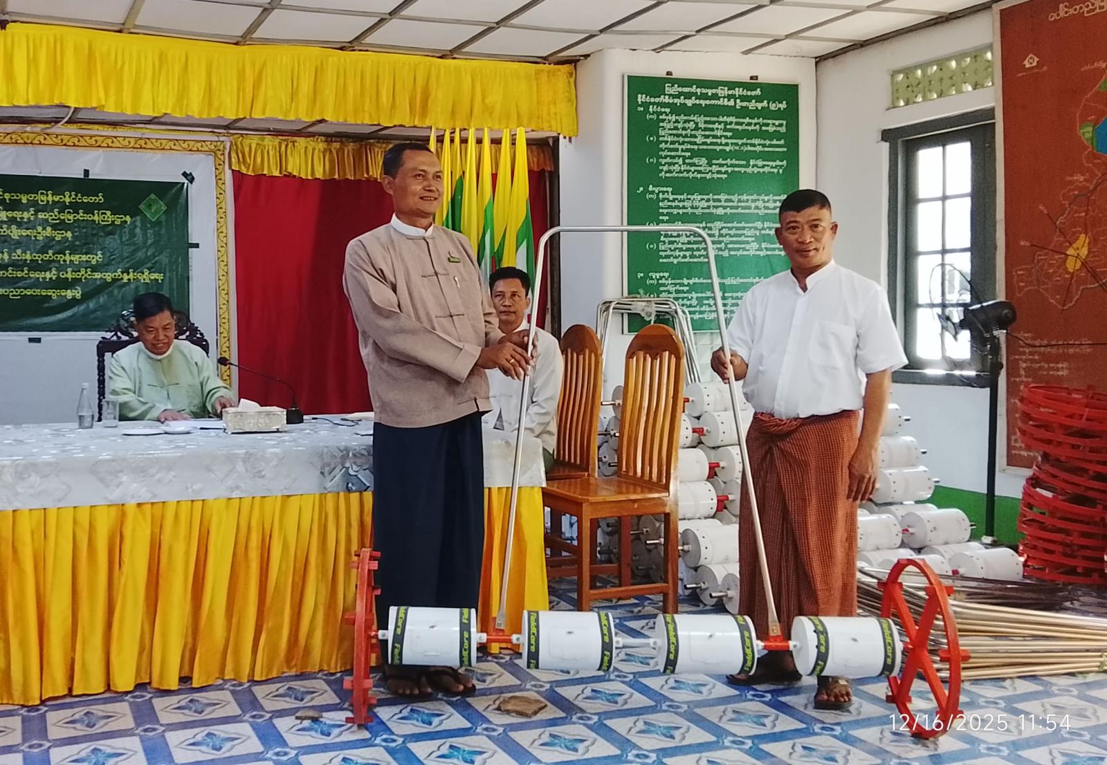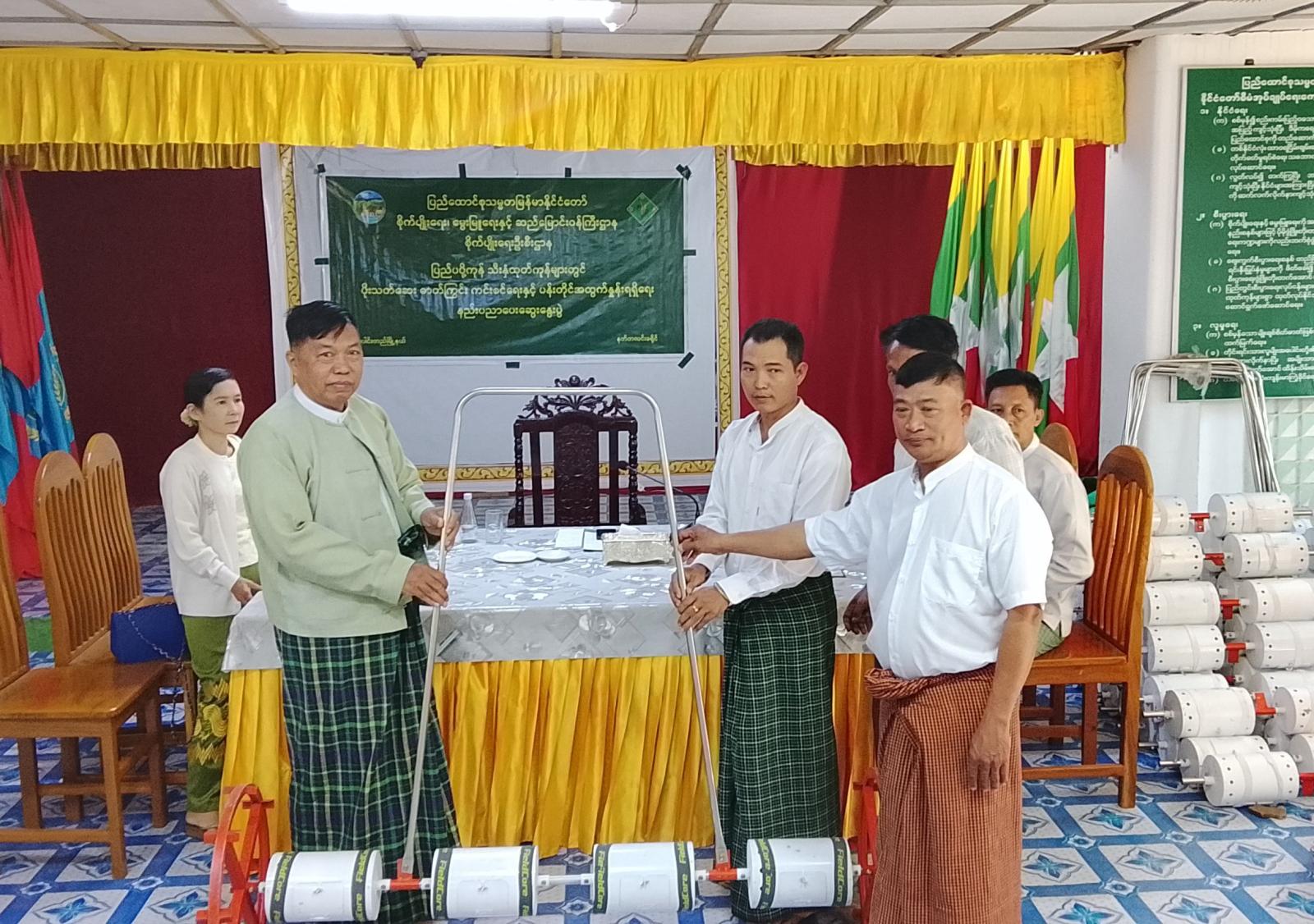 ပဲခူးတိုင်းဒေသကြီးအစိုးရအဖွဲ့၏ စီမံကြီးကြပ်မှုဖြင့် ထုတ်လုပ်သော လက်ဆွဲမျိုးစေ့ချကိရိယာ (Drum Seeder) များအား တောင်သူများ လက်ဝယ်အရောက် လွှဲပြောင်းပေးအပ်ပွဲအခမ်းအနားကို ယနေ့နံနက် ၁ဝ နာရီခွဲက မြို့နယ်အထွေထွေအုပ်ချုပ်ရေးဦးစီးဌာနခန်းမတွင် ကျင်းပပြုလုပ်သည်။