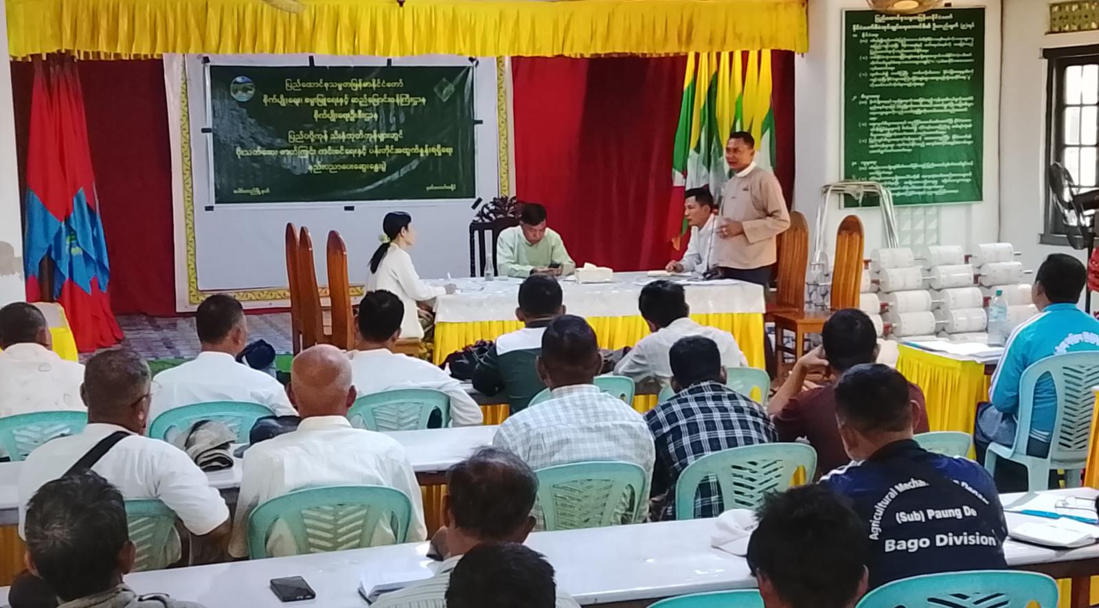 ဦးစွာ မြို့နယ်စီမံခန့်ခွဲရေးနှင့်အုပ်ချုပ်ရေးကော်မတီဥက္ကဋ္ဌ၊ မြို့နယ်စိုက်ပျိုးမွေးမြူရေးကြီးကြပ်မှုကော်မတီဥက္ကဋ္ဌ ဦးစိုးမြင့်လှိုင်က မိမိတို့မြို့နယ်အတွင်း နွေစပါး၊ မိုးစပါးအထွက်နှုန်းတိုးတက်စေရေးအတွက် လက်ဆွဲမျိုးစေ့ချကိရိယာ (Drum Seeder) ၂၂၅ ခုအား ပဲခူးတိုင်းဒေသကြီးအစိုးရအဖွဲ့မှ ဖြန့်ဖြူးပေးအပ်ခဲ့သဖြင့် တောင်သူများလက်ဝယ်သို့ လွှဲပြောင်းပေးအပ်ခြင်းဖြစ်ကြောင်း၊ တောင်သူများအနေဖြင့် Drum Seeder အသုံးပြု၍ ရာသီအလိုက် စပါးသီးနှံများ ပန်းတိုင်အထွက်နှုန်း ပြည့်မီကျော်လွန်အောင် စိုက်ပျိုးထုတ်လုပ်နိုင်ရေး ရှင်းလင်းဆွေးနွေး မှာကြားခဲ့သည်။