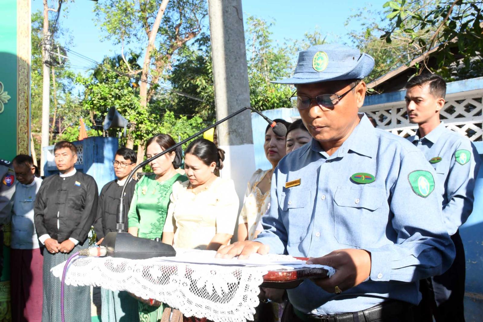ဦးစွာထားဝယ်မြို့နယ်စည်ပင်သာယာရေးအဖွဲ့၊ အင်ဂျင်နီယာမှူး ဦးနေမျိုးက မျှော်အင်းလမ်းသွယ် ကွန်ကရစ်လမ်းသစ်ဖွင့်ပွဲနှင့်ပတ်သက်၍ ရှင်းလင်းတင်ပြသည်။