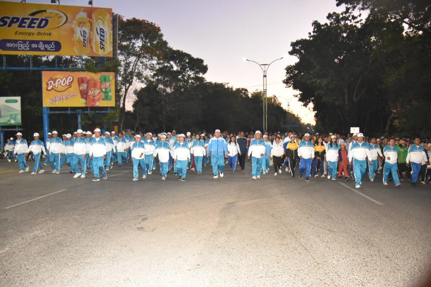 ဦးစွာ စုပေါင်းလမ်းလျှောက်ပွဲကို တိုင်းဒေသကြီးဝန်ကြီးချုပ်က သေနတ်ပစ်ဖောက်၍ လမ်းလျှောက်ပွဲအား ဖွင့်လှစ်ပေးပြီးနောက် ရွှေရုပ်တုအဝိုင်းရှေ့မှစတင်၍ မဟာဗန္ဓုလလမ်းမကြီးအတိုင်း တပျော်တပါး စုပေါင်းလမ်းလျှောက်ခဲ့ကြပြီး ကိုးသိန်းအားကစားကွင်းတွင် ကိုယ်လက်လှုပ်ရှားလေ့ကျင့်ခန်းများ၊ Physical Fitness Dance များအား အတူတကွ စုပေါင်းဆောင်ရွက်ခဲ့ကြသည်။
