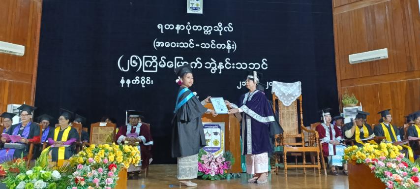 ဦးစွာ ရတနာပုံတက္ကသိုလ် ပါမောက္ခချုပ်က ၂၀၂၄ ပညာသင်နှစ်တွင် ကျင်းပပြုလုပ်ခဲ့သည့် ဝိဇ္ဇာဘွဲ့၊ သိပ္ပံဘွဲ့၊ ဥပဒေဘွဲ့ အသီးသီးအတွက် အောင်မြင်ခဲ့ကြသည့် မောင်မယ်များအား ဘွဲ့လက်မှတ်များအပ်နှင်းပြီး ဘွဲ့နှင်းသဘင်မိန့်ခွန်း မြွတ်ကြားသည်။