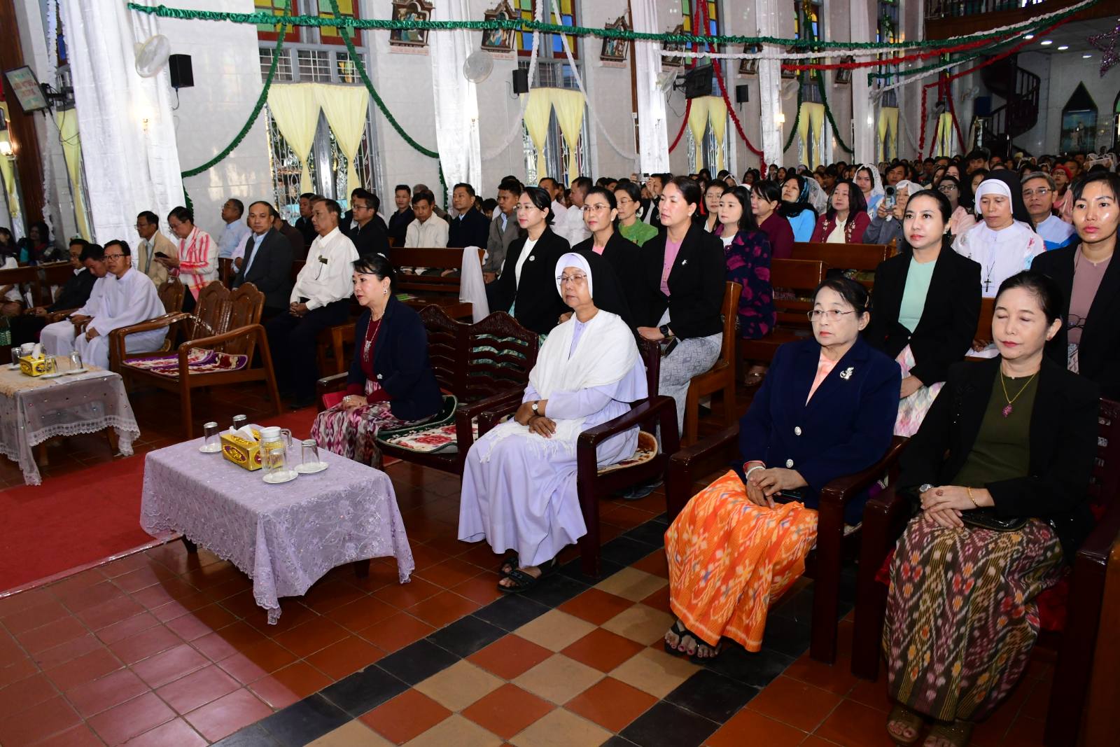 ဧရာဝတီတိုင်းဒေသကြီး၊ ပုသိမ်မြို့၊ စိန့်ပီတယ်ကက်သီဒြယ်ကျောင်း၊ ကက်သလစ်အသင်းတော် ပုသိမ်ဂိုဏ်းအုပ်သာသနာ၌ ခရစ္စမတ်နှင့် နှစ်သစ်ကူးကျေးဇူးတော် ချီးမွမ်းခြင်းအခမ်းအနားကို ယမန်နေ့နံနက်ပိုင်းကပြုလုပ်ခဲ့ရာ တိုင်းဒေသကြီးဝန်ကြီးချုပ်နှင့် ဇနီး၊ အစိုးရအဖွဲ့ဝင် ဝန်ကြီးများနှင့် ၎င်းတို့၏ဇနီးများ၊ ဌာနဆိုင်ရာများတက်ရောက်ခဲ့ကြသည်။