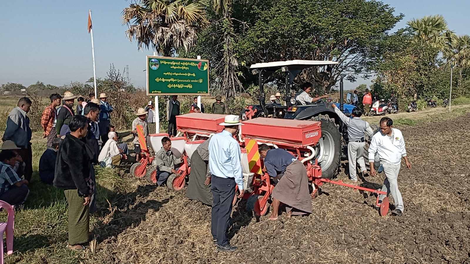 မန္တလေးတိုင်းဒေသကြီး၊ ကျောက်ဆည်ခရိုင်၊ မြစ်သားမြို့နယ် စက်မှုလယ်ယာဦးစီးဌာန၊ အမှတ် (၆၄) စက်မူလယ်ယာစခန်းတွင် ပြောင်းမျိုးစေ့ချကိရိယာ (Pneumatic Seeder) ဖြင့် စိုက်ပျိုးခြင်း ကွင်းသရုပ်ပြပွဲကို ဒီဇင်ဘာ ၃၀ ရက် နံနက် ၉ နာရီက ရွာသစ်ကျေးရွာအုပ်စု ကွင်းအမှတ် ၄၄ ဦးပိုင်အမှတ် ၂၂ တောင်သူဦးတင်ညွန့်၏ လယ်မြေ၌ ကျင်းပပြုလုပ်ခဲ့သည်။