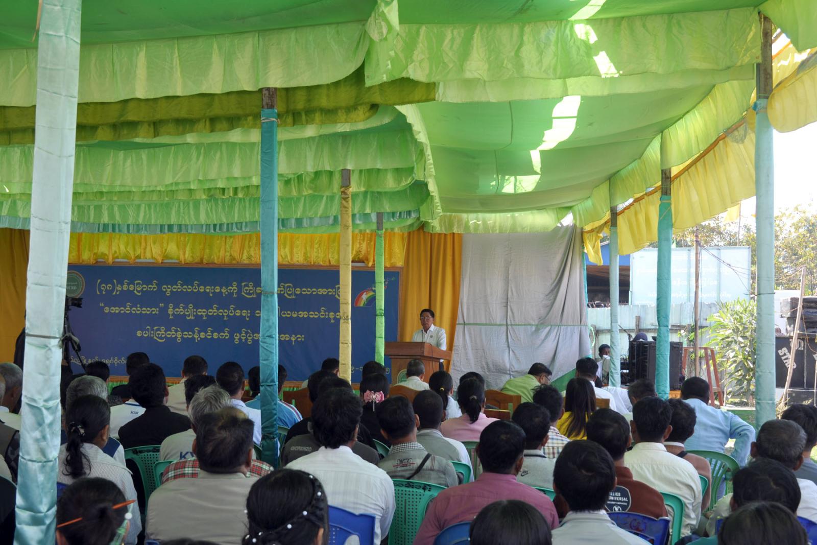 ထို့နောက် ဖွင့်ပွဲအထိမ်းအမှတ်အခမ်းအနားကို ကျင်းပခဲ့ရာ တိုင်းဒေသကြီးဝန်ကြီးချုပ် ဦးတင့်လွင်က အဖွင့်အမှာစကားပြောကြားရာတွင် မကွေးတိုင်းဒေသကြီးအနေဖြင့် အမျိုးသားကာကွယ်ရေးနှင့် လုံခြုံရေးကောင်စီ၏ ဦးတည်ချက်(၄)ရပ်မှာ ပါဝင်တဲ့ “နိုင်ငံ့စီးပွားဖွံ့ဖြိုးတိုးတက်ရေး၌ အဓိကနှင့်အခြေခံအုတ်မြစ်ဖြစ်သည့် စိုက်ပျိုးရေးကဏ္ဍ စဉ်ဆက်မပြတ်တိုးတက်၍ စိုက်ပျိုးမွေးမြူရေးကိုအခြေခံသည့် စက်မှုကဏ္ဍ ဖွံ့ဖြိုးတိုးတက်မှုမှသည် ပြည်သူတို့၏ လူမှုစီးပွားဘဝကို စဉ်ဆက်မပြတ်မြှင့်တင်ရေး” ဟူသည့် ဦးတည်ချက်နှင့် “နိုင်ငံတော်ရွှေသီးဖို့ ကုန်ထုတ်လုပ်မှုအားပေးစို့” ဟူသော ဆောင်ပုဒ်နှင့်အညီ မိမိတို့ကဒေသလိုအပ်ချက်ကို ဖြည့်ဆည်းထားပြီးဖြစ်လို့ အသင်းသားပိုင် စပါးအခြောက်ခံစက် မှာ တစ်ရက် တင်းပေါင်း (၈၀၀)၊ အသင်းပိုင်စပါးကြိတ်ခွဲသန့်စင်စက်မှာ တစ်ရက်တင်း ပေါင်း (၁၄၀၀)ကျော် ကြိတ်ခွဲသန့်စင်ပေးနိုင်ပြီး လယ်ဧက(၁၅၀၀)ကျော်၊ တောင်သူ(၇၀၀)ဦးခန့်ကို အကျိုးပြုနိုင်မှာဖြစ်ပါတယ်၊ ဒါ့အပြင် ဒီအသင်းမှာပါဝင်တဲ့ အသင်းသားတောင်သူ(၁၂၀၈)ဦး သာမကအသင်းသား မဟုတ်သူတောင်သူများကိုလည်း အသင်းဝင်စေပြီး တောင်သူတွေရဲ့ အကျိုးစီးပွားကို ဆောင်ရွက်ပေးနိုင်မှာဖြစ်ပြီး၊ အသင်းအနေဖြင့်လည်း အသင်းဖွဲ့စည်းစဉ်က ရည်ရွယ်ချက်ပါ အတိုင်းအသင်းသားများ၏ အကျိုးကိုရှေ့ရှု၍ လုပ်ငန်းများ အမှန်တကယ်အကောင်အထည်ဖော်နိုင်အောင်ဆောင်ရွက်ပြီး၊ ထွက်ရှိလာသော ဆန်များကိုလည်း ဈေးနှုန်းချိုသာစွာဖြင့် ရောင်းချဖြန့်ဖြူးနိုင်ရေး၊ အသင်းရေရှည်ရပ်တည်အောင်မြင်ရေးအတွက် အသင်းသားများဘက်ကလည်း ဝိုင်းဝန်းကြိုးပမ်းဆောင်ရွက်သွားကြရန် ပြောကြားခဲ့သည်။