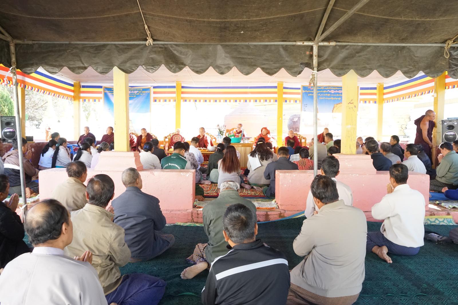 ရှေးဦးစွာ အခမ်းအနားကို ကြွရောက်တော်မူလာကြကုန်သော ဆရာတော်သံဃာတော်မြတ်များနှင့် ဧည့်ပရိတ်သတ်အပေါင်းတို့က နမောဒဿသုံးကြိမ်ရွတ် ဘုရားကန်တော့ကြပြီး၊ ဧည့်ပရိတ်သတ်များမှ ပင်းတယမြို့နယ် သံဃနာယကဥက္ကဋ္ဌ ရွာငယ်ကျောင်းသစ် ဆရာတော်ဦးစန္ဒောဘာသအား ရှိခိုးကန်တော့ကြ၍ ဆရာတော်ထံမှ ငါးပါးသီလခံယူဆောက်တည်ကြသည်။ ဆက်လက်၍ သံဃာတော်များက ပရိတ်တရားတော်ကို ရွတ်ပွားချီးမြှင်ပေးကြကာ မြို့နယ်သံဃနာယကဥက္ကဋ္ဌက ရေစက်ညွန်းပေးပြီး လှူဒါန်းမှုအစုစုတို့အတွက် ရေစက်သွန်းချအမျှပေးဝေခဲ့၍ အခမ်းအနားကို ဗုဒ္ဓသာသနံ စိရံ တိဋ္ဌတု သုံးကြိမ်ရွတ်ရုတ်သိမ်းခဲ့ကြောင်းသိရသည်။ ထို့နောက် သံဃာတော်များ၊ အလှူရှင်များနှင့်ဧည့်ပရိတ်သတ်အပေါင်းတို့မှ သတ်မှတ်နေရာများတွင် နေ့နံအလိုက် ပန္နက်တင်ခြင်းမင်္ဂလာကို ဆက်လက်ဆောင်ရွက်ခဲ့ကြကြောင်း သိရသည်။
