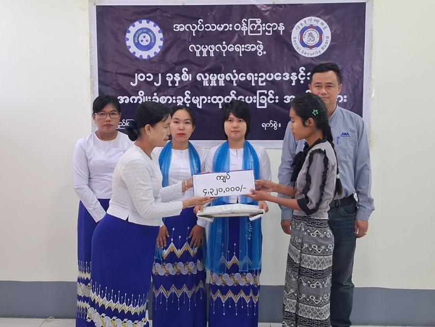 ရှေးဦးစွာ မန္တလေးတိုင်းဒေသကြီး၊ တိုင်းဒေသကြီးလူမှုဖူလုံရေးရုံးမှ တိုင်းဒေသကြီးတာဝန်ခံ အရာရှိ ဒုတိယညွှန်ကြားရေးမှူး ဒေါ်ကြည်ကြည်ထွန်းက ၂၀၁၂ ခုနှစ် လူမှုဖူလုံရေးဥပဒေပါ အကျိုးခံစားခွင့်များအကြောင်းကို အသေးစိတ်ရှင်းလင်းပြောကြားခဲ့သည်။ ဆက်လက်ပြီး တိုင်းဒေသကြီး လူမှုဖူလုံရေးရုံးမှ တိုင်းဒေသကြီးတာဝန်ခံအရာရှိ ဒုတိယညွှန်ကြားရေးမှူး ဒေါ်ကြည်ကြည်ထွန်းက စပါးနှံတာယာနှင့် ကျွတ်စက်ရုံမှ အာမခံအလုပ်သမား ဦးသက်ပိုင်ဝင်းထွန်းအောင်၏ လုပ်ငန်းခွင်ထိခိုက်ဒဏ်ရာရရှိ သေဆုံးခဲ့ခြင်းအတွက် နာရေးစရိတ် အကျိုးခံစားခွင့်နှင့် ကျန်ရစ်သူအကျိုးခံစားခွင့်အတွက် စုစုပေါင်းတန်ဖိုးငွေ (ကျပ်လေးဆယ်သုံးသိန်းနှစ်သောင်းတိတိ)အား ဇနီးဖြစ်သူ ဒေါ်အိရွှေဇင်ဦးအား အကျိုးခံစားခွင့်ငွေ ပေးအပ်ခဲ့ကြောင်း သိရသည်။