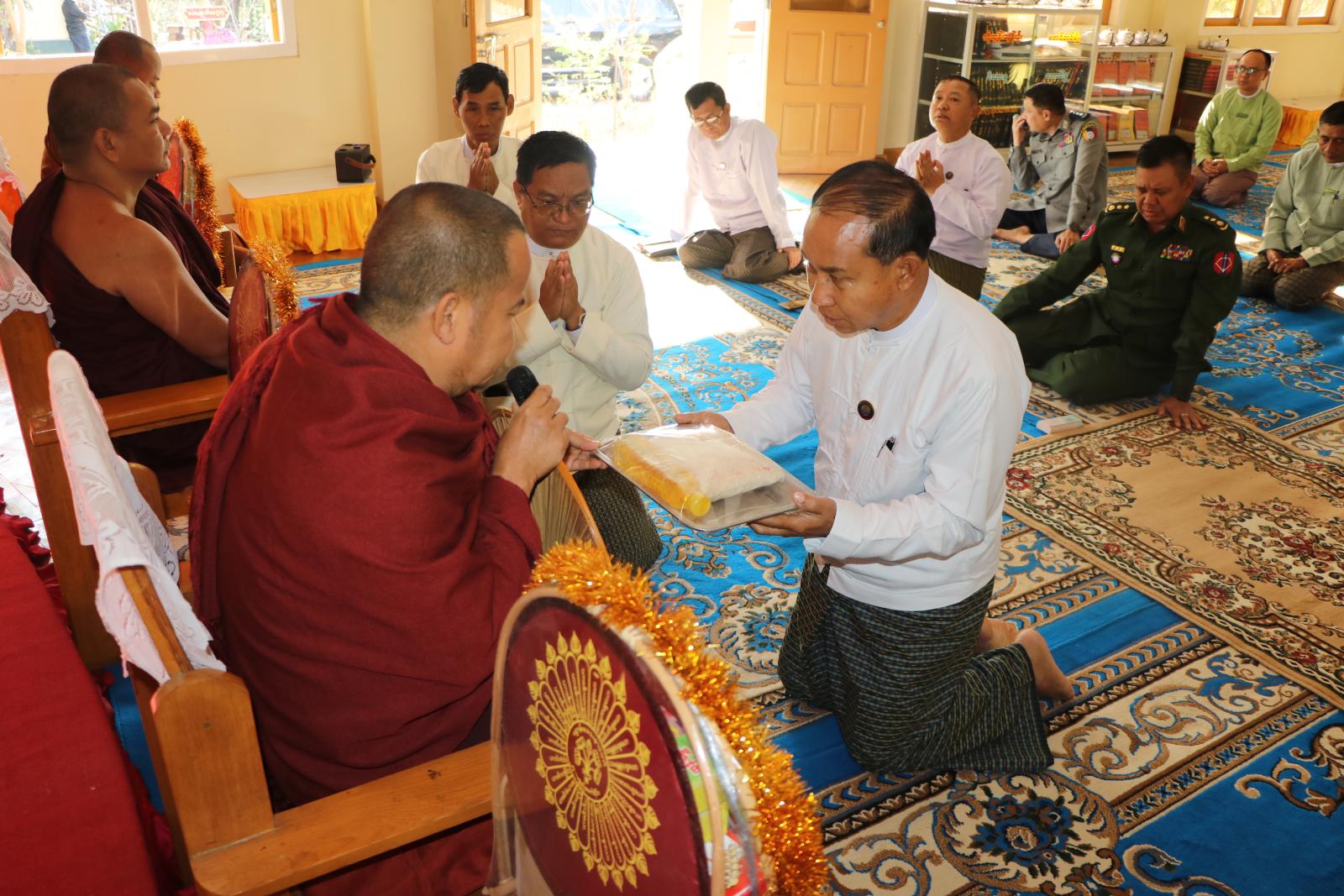 ယင်းနောက် ပင့်သံဃာဆရာတော်ကြီးများထံ တိုင်းဒေသကြီးဝန်ကြီးချုပ်နှင့် တိုင်းဒေသကြီးအစိုးရအဖွဲ့ဝင်များက လှူဖွယ်ဝတ္ထုပစ္စည်းများနှင့်ဆွမ်းဆန်၊ဆီများ ဆက်ကပ်လှူဒါန်းကြသည်။