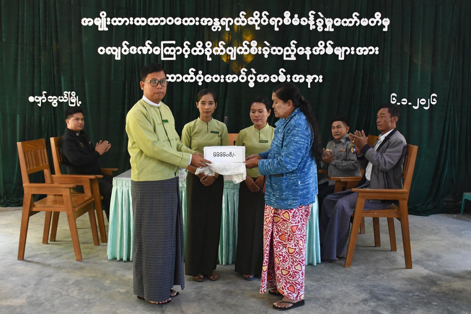 အမျိုးသားသဘာဝဘေးအန္တရာယ်ဆိုင်ရာ စီမံခန့်ခွဲမှုကော်မတီမှ ဝါးထရံအိမ် တစ်စိတ်တစ်ပိုင်းပျက်စီးမှုအတွက် ငွေကျပ် ၆ သိန်းကျော်၊ ဝါးထရံအိမ်အလုံးစုံ ပျက်စီးမှုအတွက် ငွေကျပ်သိန်း ၂၀၊ ပျဉ်ထောင်အိမ်တစ်ထပ် အလုံးစုံပျက်စီးမှုအတွက် ငွေကျပ်သိန်း ၁၀၀၊ စုစုပေါင်းနေအိမ် ၃ လုံးအတွက် ပေးအပ်ခဲ့ရာ မြို့နယ် စီမံခန့်ခွဲရေးနှင့်အုပ်ချုပ်ရေးကော်မတီဥက္ကဋ္ဌနှင့် အဖွဲ့ဝင်များက ထပ်ဆင့်ပေးအပ်ခဲ့ကြောင်း သိရသည်။