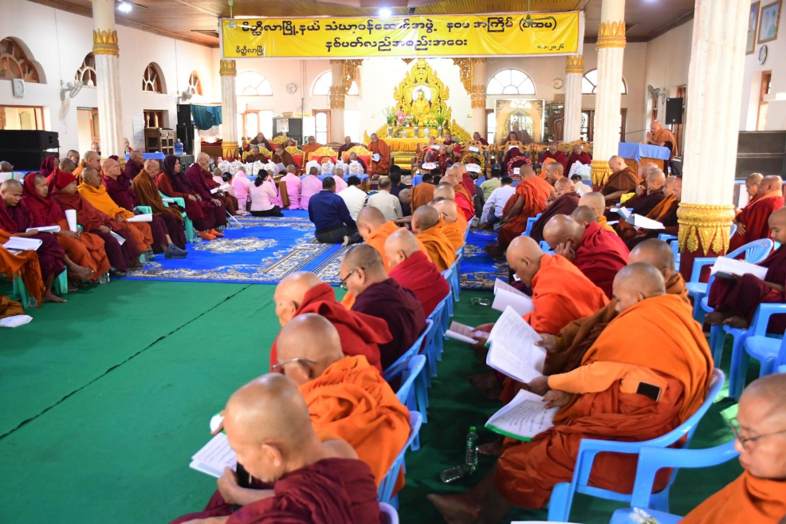 မြို့နယ်စီမံခန့်ခွဲရေးနှင့် အုပ်ချုပ်ရေးကော်မတီဥက္ကဋ္ဌ ဦးဇော်အောင်လေးက သာသနာရေးဆိုင်ရာကိစ္စရပ်များနှင့် စပ်လျဉ်း၍ လျှောက်ထားပြီး တစ်နှစ်တာကာလအတွင်း သာသနာ့တာဝန်ထမ်းဆောင်တော်မူကြရင်း ပျံလွန်တော်မူသွားကြသော မြို့နယ်သံဃာ့ဝန်ဆောင် ဆရာတော်များအတွက် သံဝေဂဉာဏ်ပွားများသောအားဖြင့် အနိစ္စာဝတ သင်္ခါရာ စသောသုံးဂါထာကို ကြွရောက်မူကြသည့် သံဃာတော်များက ရွတ်ဆိုမှတ်တမ်းခြင်း၊ တစ်နှစ်တာကာလအတွင်း ဆောင်ရွက်ခဲ့သော မြို့နယ်သံဃနာယကအဖွဲ့၏ အစီရင်ခံစာကိုအကျဉ်းကို အကျိုးဆောင်ဆရာတော်က တင်သွင်းလျှောက်ထားခြင်းများ ဆောင်ရွက်သည်။