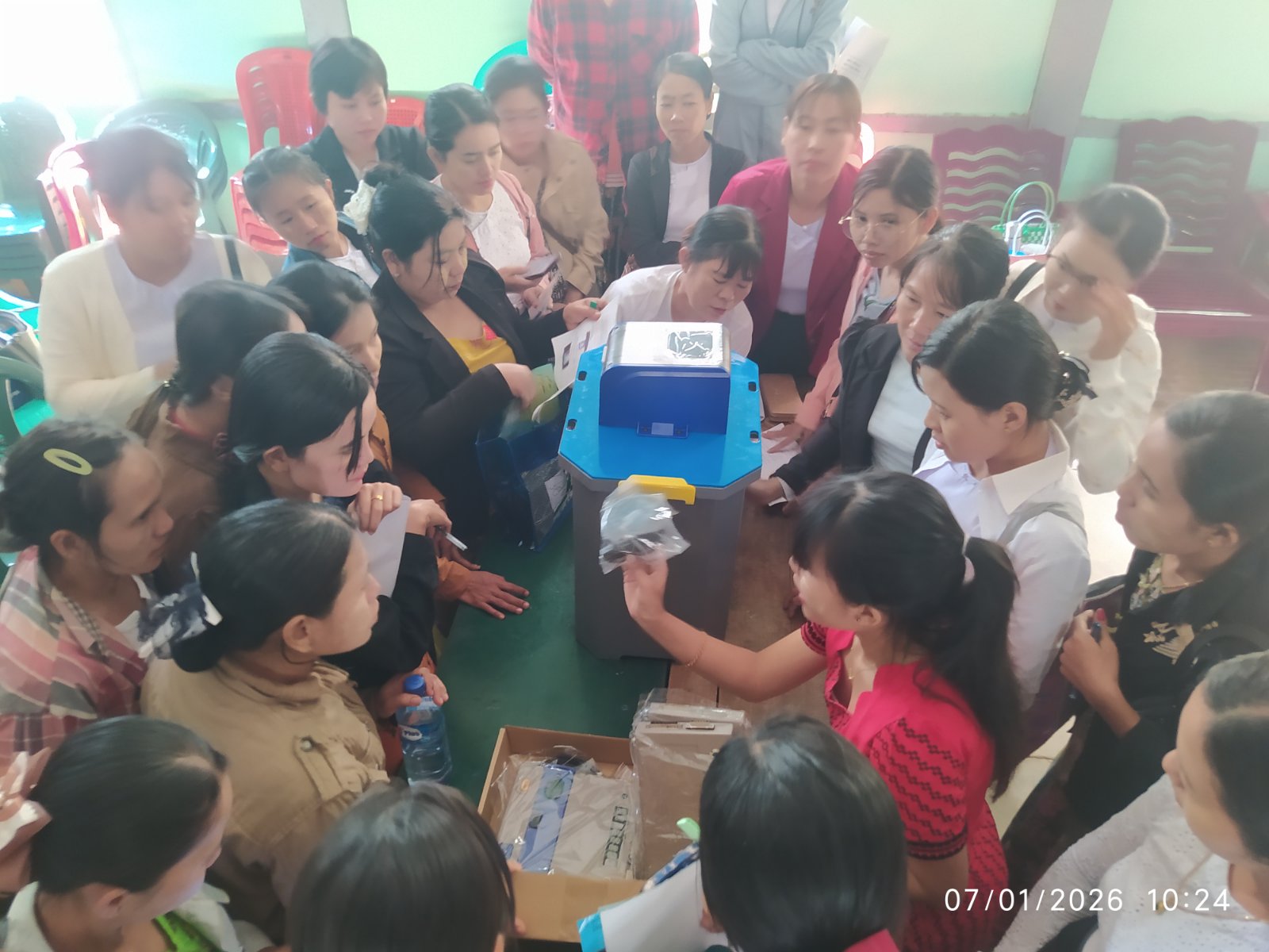 ယင်းနောက် မဲပေးစက်များအား မြို့နယ်အဆင့် နည်းပညာအထောက်အကူပြုအဖွဲ့က ရွေးကောက်ပွဲ၌အသုံးပြုကြမည့် MEVM မဲပေးစက်များ တပ်ဆင်အသုံးပြုပုံများကို အဖွဲ့ (၅)ဖွဲ့ခွဲကာ လက်တွေ့ကိုင်တွယ် ပြသခဲ့သည်။